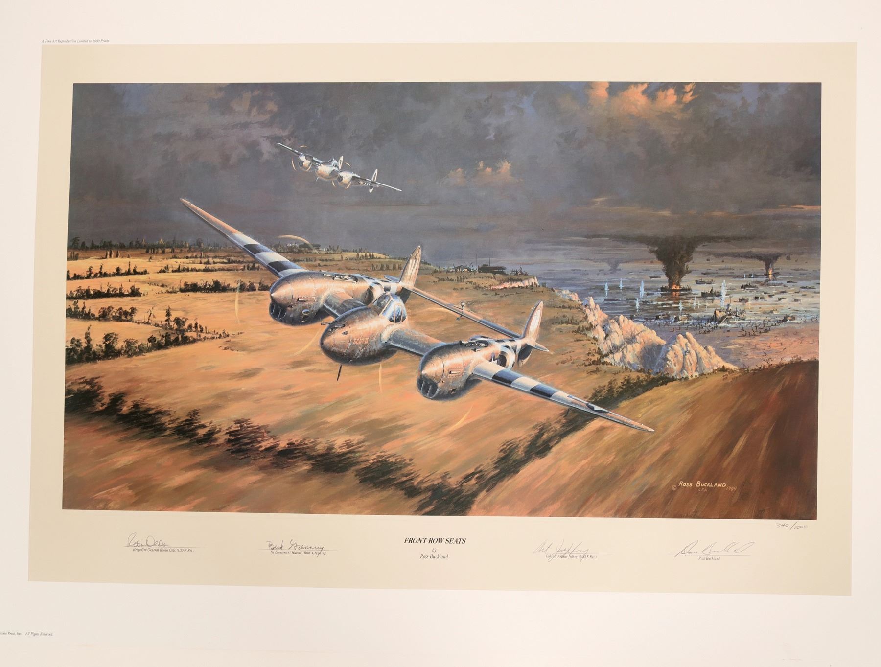 Lt. Robin Olds and his wingman, Lt. Harold F. "Bud" Grenning, roar over beachhead bluffs in a turn back out to sea. Flying air cover in their P-38 Lightning for the Allied Fleet and D-Day invasion force. Signatures: Brig. General Robin OLDS, Harold F. "Bud"GRENNING, Col. Arthur F. JEFFREY