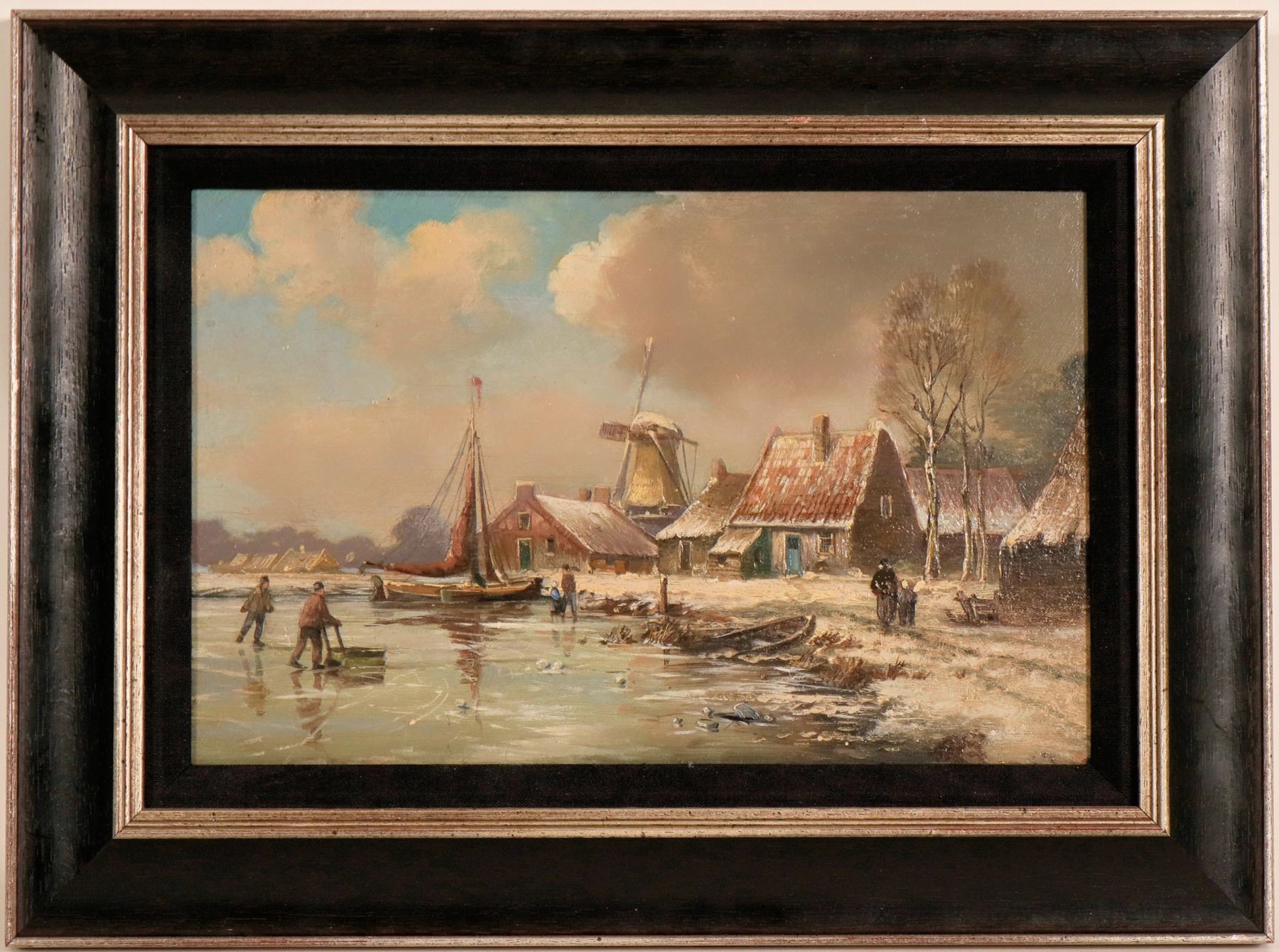 Unsigned oil painting reproduction, "Frozen Fishing Harbor" by Jan Jacob Spohler (1811-1866), born in Amsterdam. He was a 19th-century painter . He devoted his life to the portrayal of the Dutch landscape, following the Romantic Movement. Image of houses, windmill and skaters on pond with boats moored. Oil on wood, 7.75" x 11.75". Framed with linen liner,