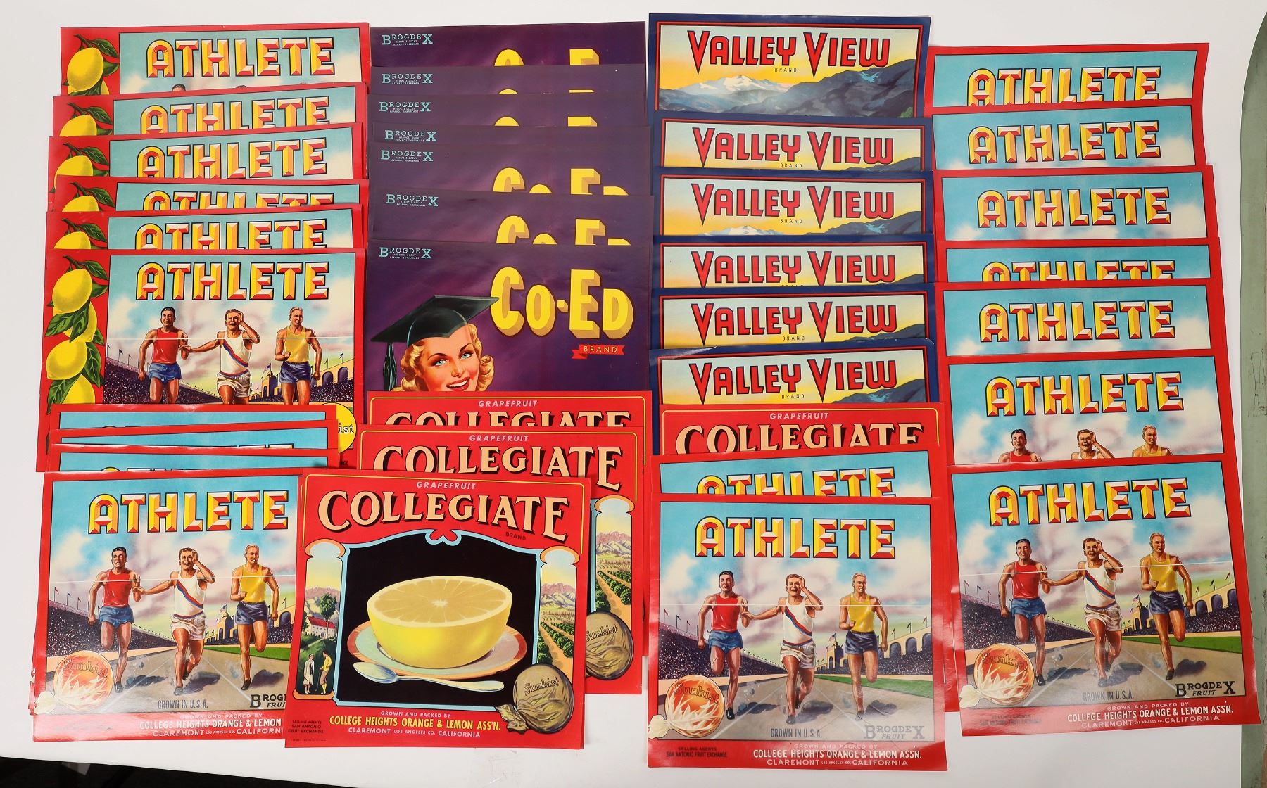 Fruit crate label collection featuring several duplicates for Collegiate Grapefruit, Valley View. Athlete & Co-Ed Brand. All appear unused. Please see photos for more details. California Los Angeles 1900s