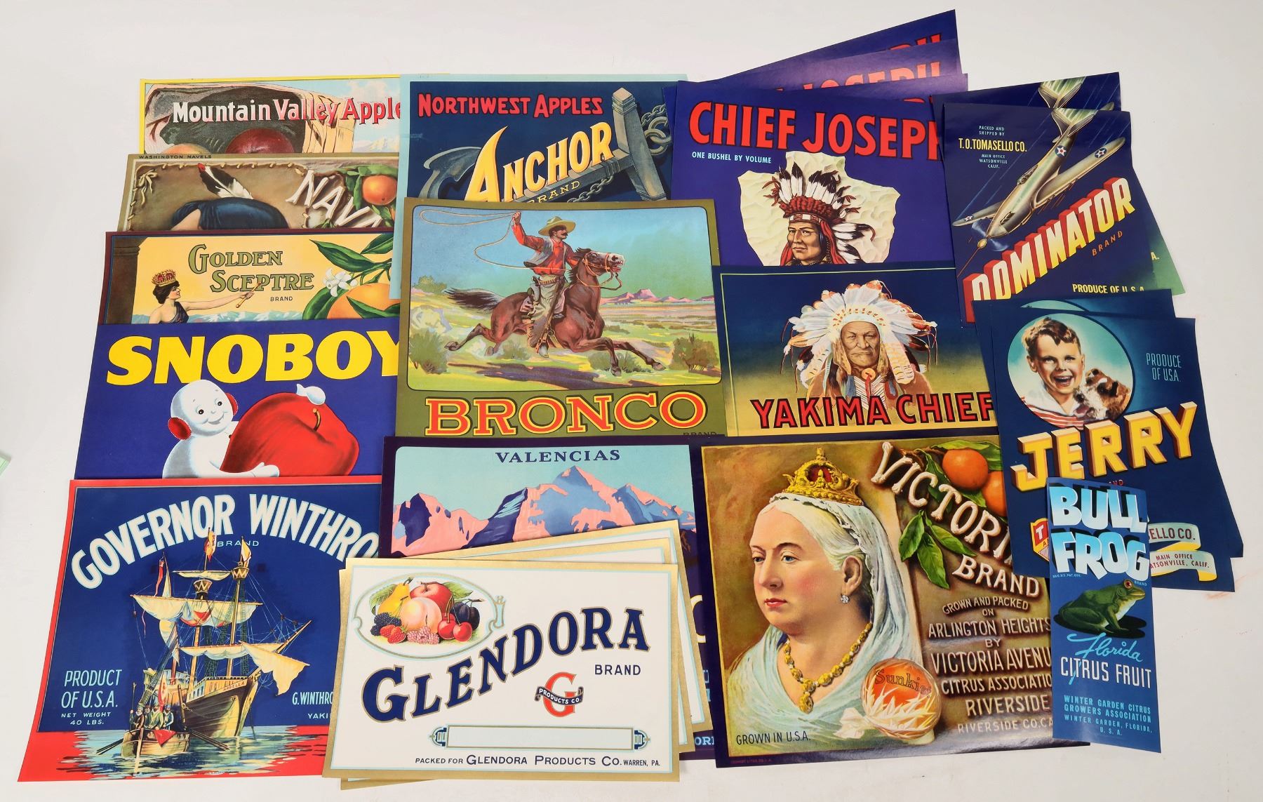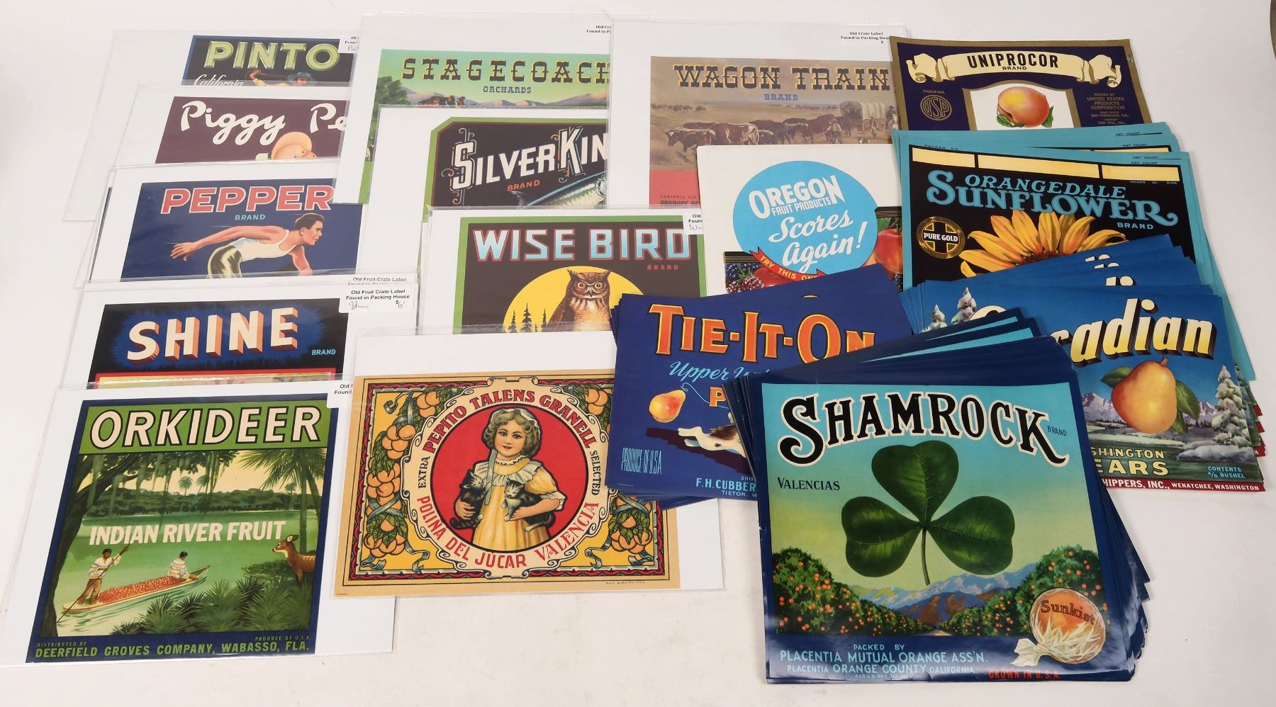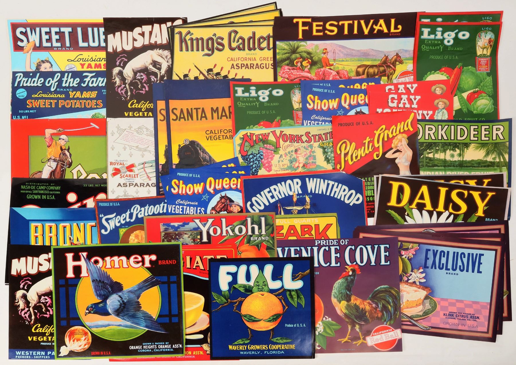About 400 assorted fruit and vegetable crate labels. Pears, citrus, yams and more.