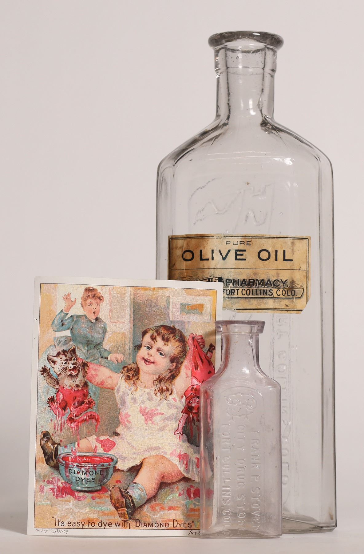 Two different drugstore bottles, Ft. Collins, Colo., clear, no apparent chips or cracks: Scott's Pharmacy/ Fort Collins, Colo., with original label on backside- Pure// Olive Oil// Scott's Pharmacy// Fort Collins, Colo., 8.5", mint; Frank P. Stover/ City Drug Store/ Fort Collins, Colo, stain, 3.5". Lot includes 3.25x4.25" advertisement, C.E. Lull, Druggist, Fort Collins, Colo.