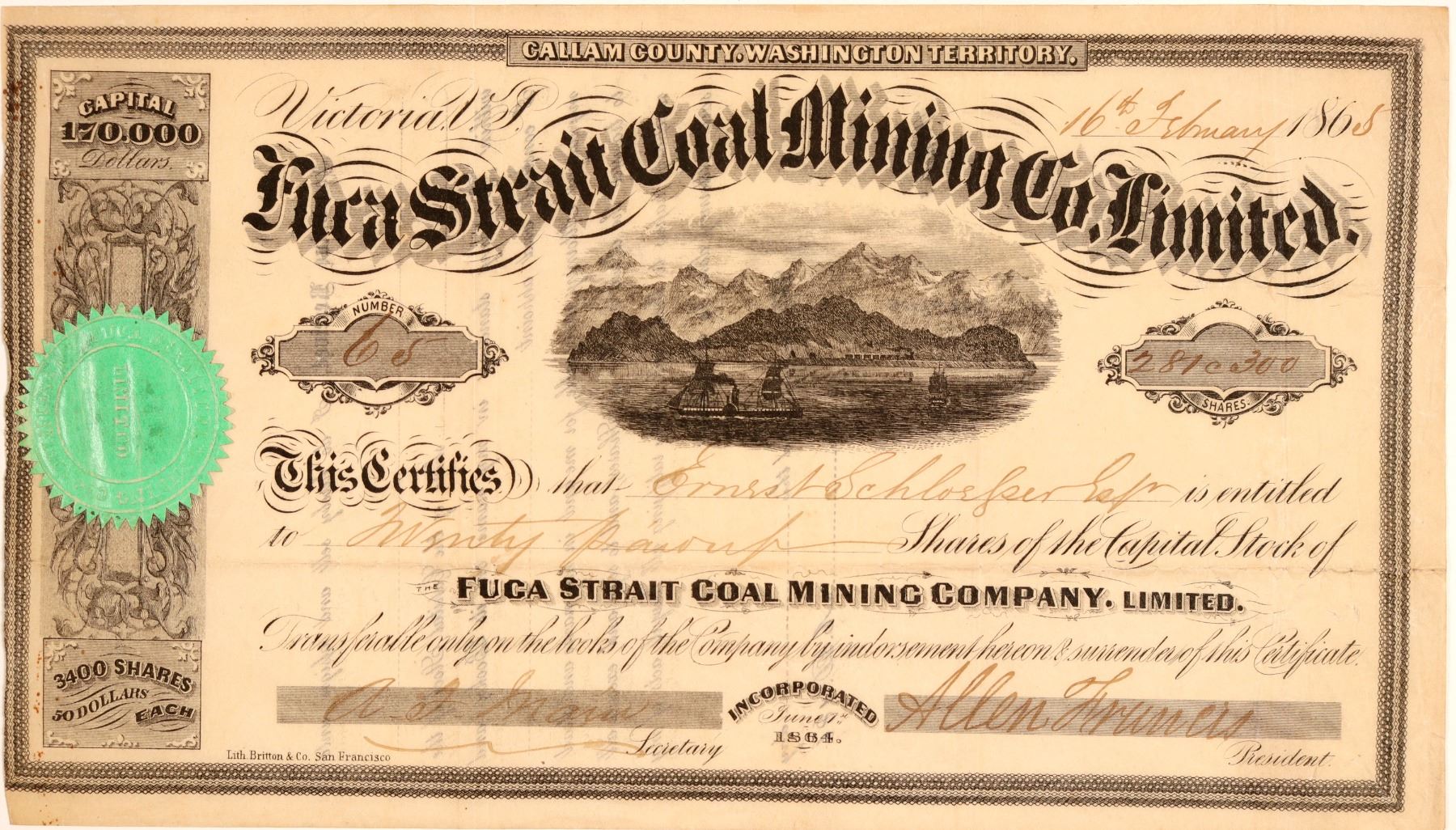 Fantastic! "Callam[sic.] County, Washington Territory" (printed at top center). Inc. 1864. Dateline Victoria, V.I., Feb. 16th, 1865. No. 65, issued for 20 shares to Ernest Schloefser. Signed by president Allen Francis and secretary AF Main. Not cancelled. Black border and print, green seal, and stunning vignette of paddle steamers in a bay with mountains in the background. Printed by Britton & Co., San Francisco. Pinholes, folds, creases. 5.25 x 9.5" According to a prospectus for the company printed in The Vancouver Times (Nov. 5, 1864), the company worked two seams of high quality coal located on the southern shore of the Straits of Fuca, about 20 miles inside of Cape Flattery. The cliff with the deposit runs from Clallum Bay to Pillar Point. The company owns 1,760 acres, including the whole of the land around Clallum Bay (about 600 acres) plus 1,200 acres of level land that will be the coal field. They have erected 13 buildings, a jetty for loading vessels, and a large coal stage. Several hundreds of tons of coal have already been taken out.