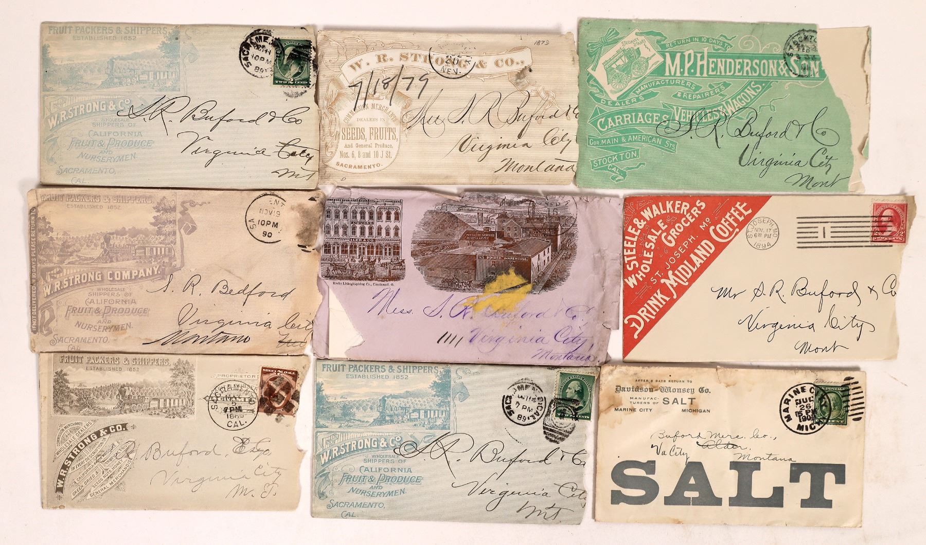 9 full face advertising covers c. 1879-94. Salt, coffee, carriages, fruit, liquor, seeds, etc. Some with stamps.