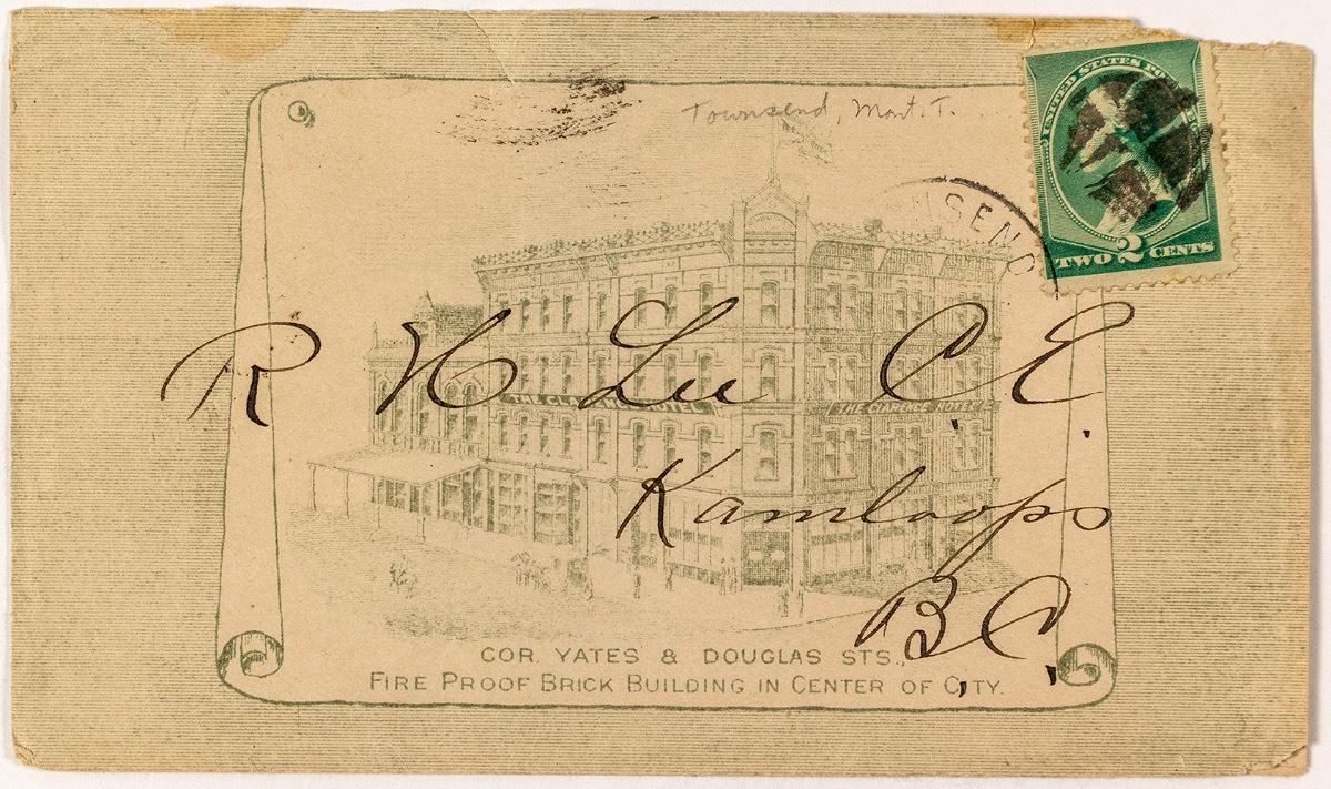 Full page ad for the Clarence Hotel on the corner of Yates & Douglas. Hotel is actually in Victoria. Very weak Townsend cancel. Date can not be certain, but perhaps territorial. Large piece of the back has been cut out, but does not affect the front. Addressed to Kamloops, Canada. City: Townsend State: Montana Date: c1890 ID: 37046