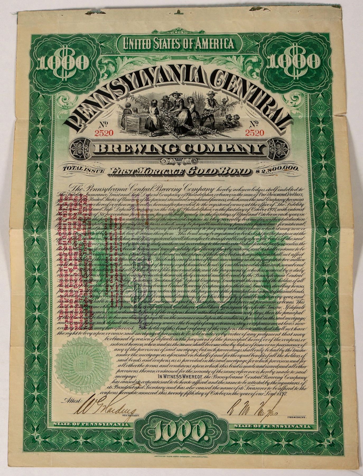 Fullycashed in stock certificate issued by Pennsylvania Central Brewing Company. This certificate is a nice looking piece with a vignette of workers gathering hops. Cert is numbered 2520 and signed by both secretary and president of the company. Please see photos for more detail and condition.