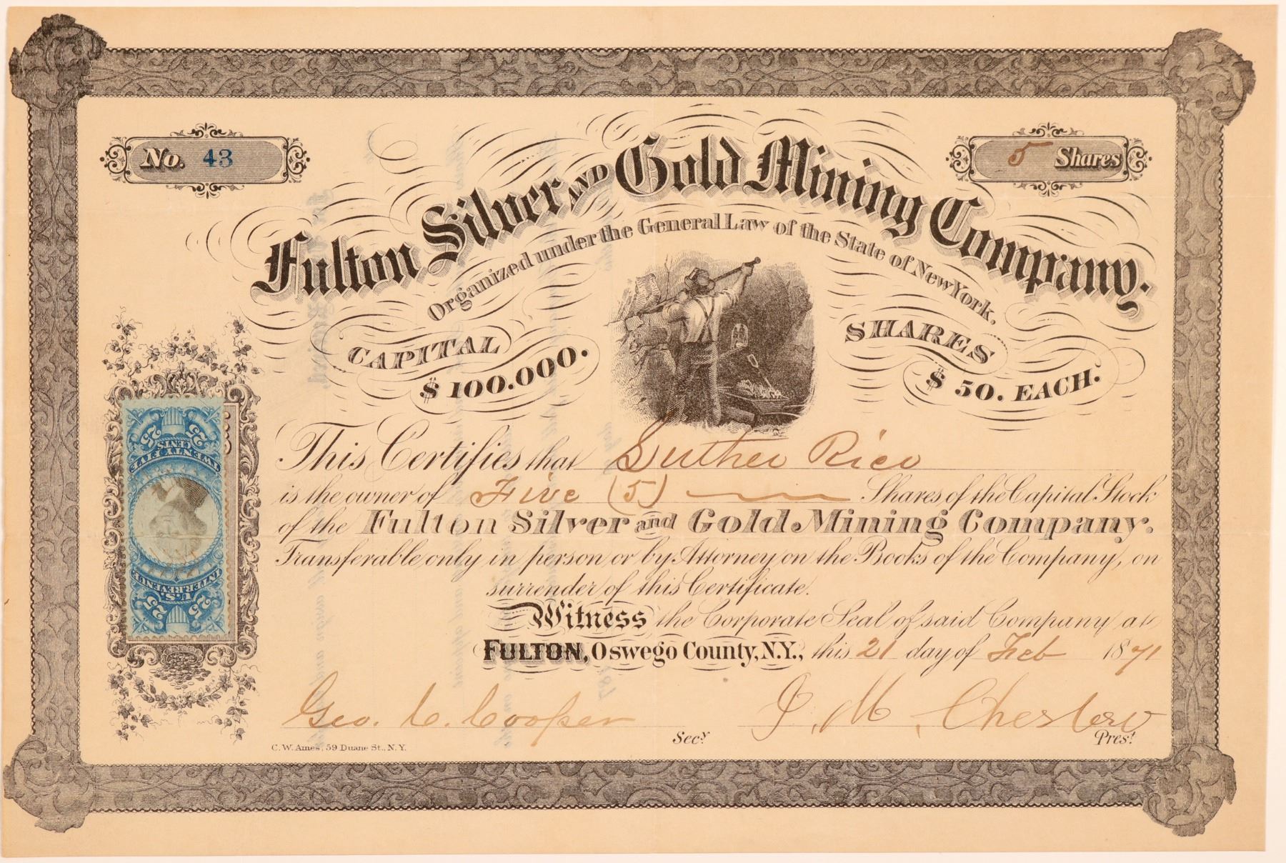 This is possibly a Nevada mining company (see the Fulton mine in Virginia City, Nevada Territory). There was also a Fulton mine in 1860s Clear Creek County, Colorado. Not in Filer or other Holabird indexes. No listings found on newspapers.com. We could not definitively locate this company at this time. Inc. in New York. No. 43, issued for 5 shares to Suther Rice on Feb. 21st, 1871 in Fulton, New York. Signed by president Chester and secretary Geo. C. Cooper. Not cancelled. Black border and print. Close-up vignette of miner working underground. 25c revenue stamp attached on the left. Printed by C.W. Ames, NY. Folds, toning. 7 x 10.5" City: State: Nevada Date: 1871