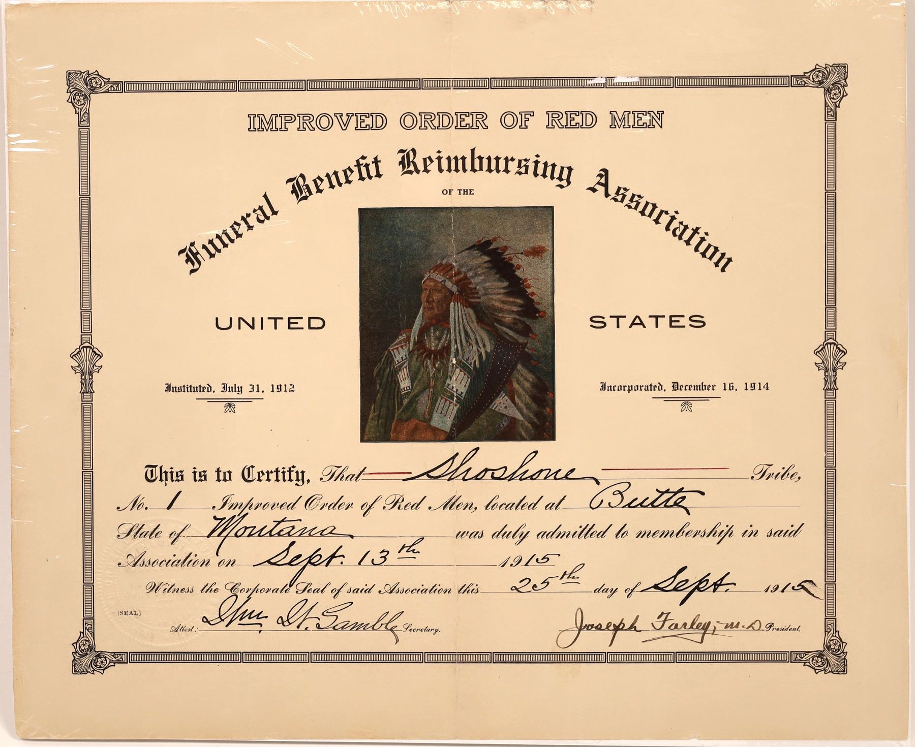 A little known "Improved Order of Red Men Benefit Reimbursement Association" of the United States (the IORM), is the oldest fraternal order in the U.S. They believe in: Love of and respect for the American Flag, Preserving our Nation by defending and upholding the principle of free Government, America and the democratic way of life. This chapter in Butte, Montana was to certify the Shoshone tribe on September 13, 1915 and signed by William Gamble, secretary, and Joseph Farley, MD President. Printed at 11in.X 13 in. several folds.