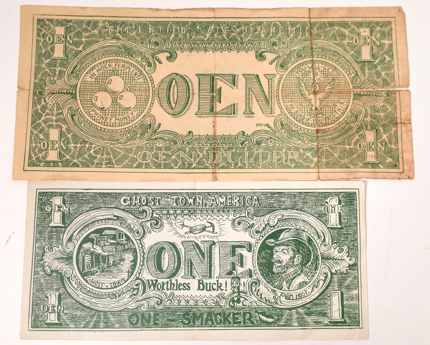 Two pieces or rare humorous fake currency. One is a souvenir from Knott's Ghost Town. It is from a private edition by Philip H. Gilkerson, copyrighted 1953. The other is another phony one-dollar bill. Different sizes, the Ghost Town one is 10.25 x 4.75, the other is 12.25 x 5.5 inches. The Ghost Town dollar is in good condition, the other has some tears along the creases.