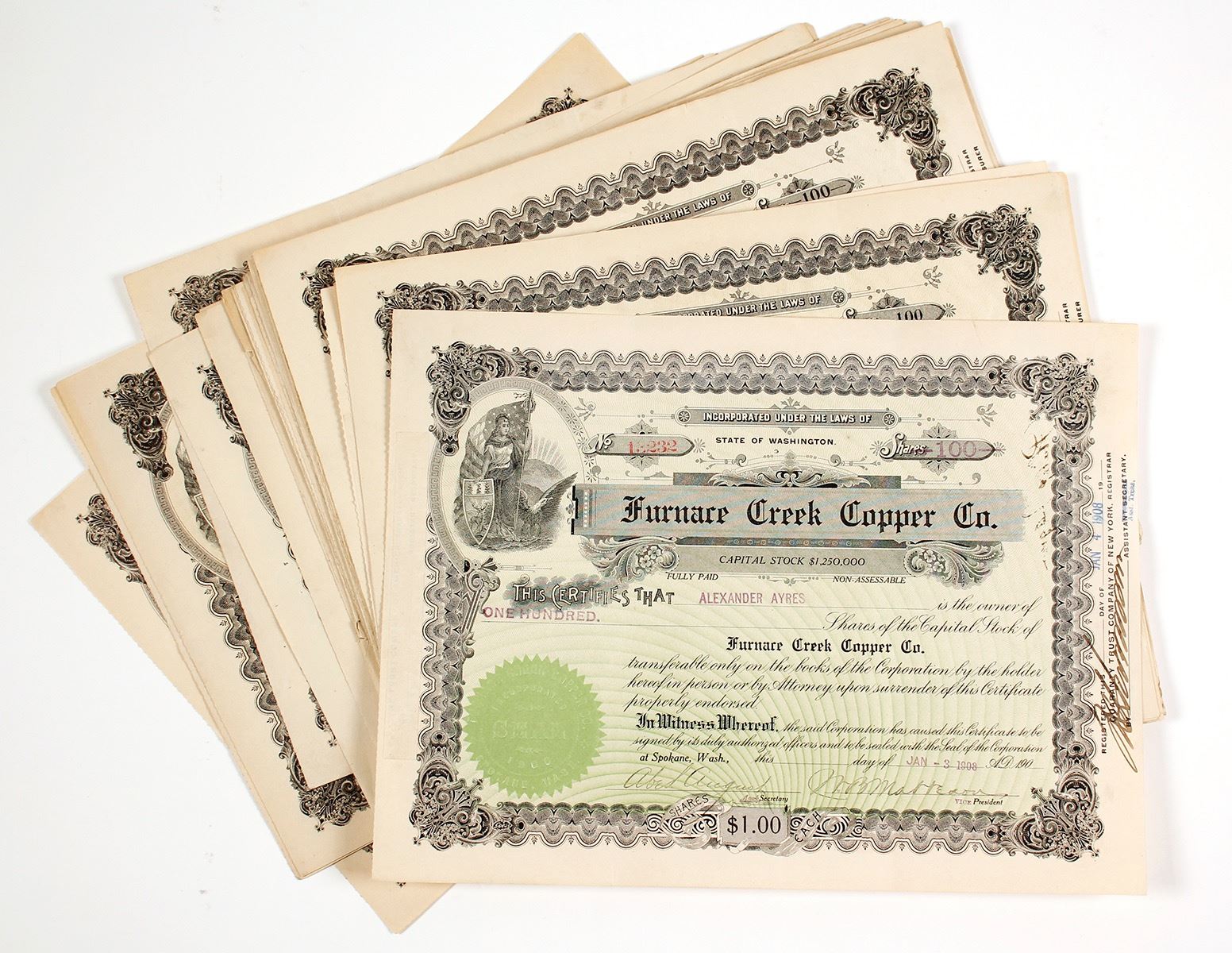 31 Stocks Certs. I/C, shares 100. Date: early 1900's Location: Death Valley, California HWAC# 63963