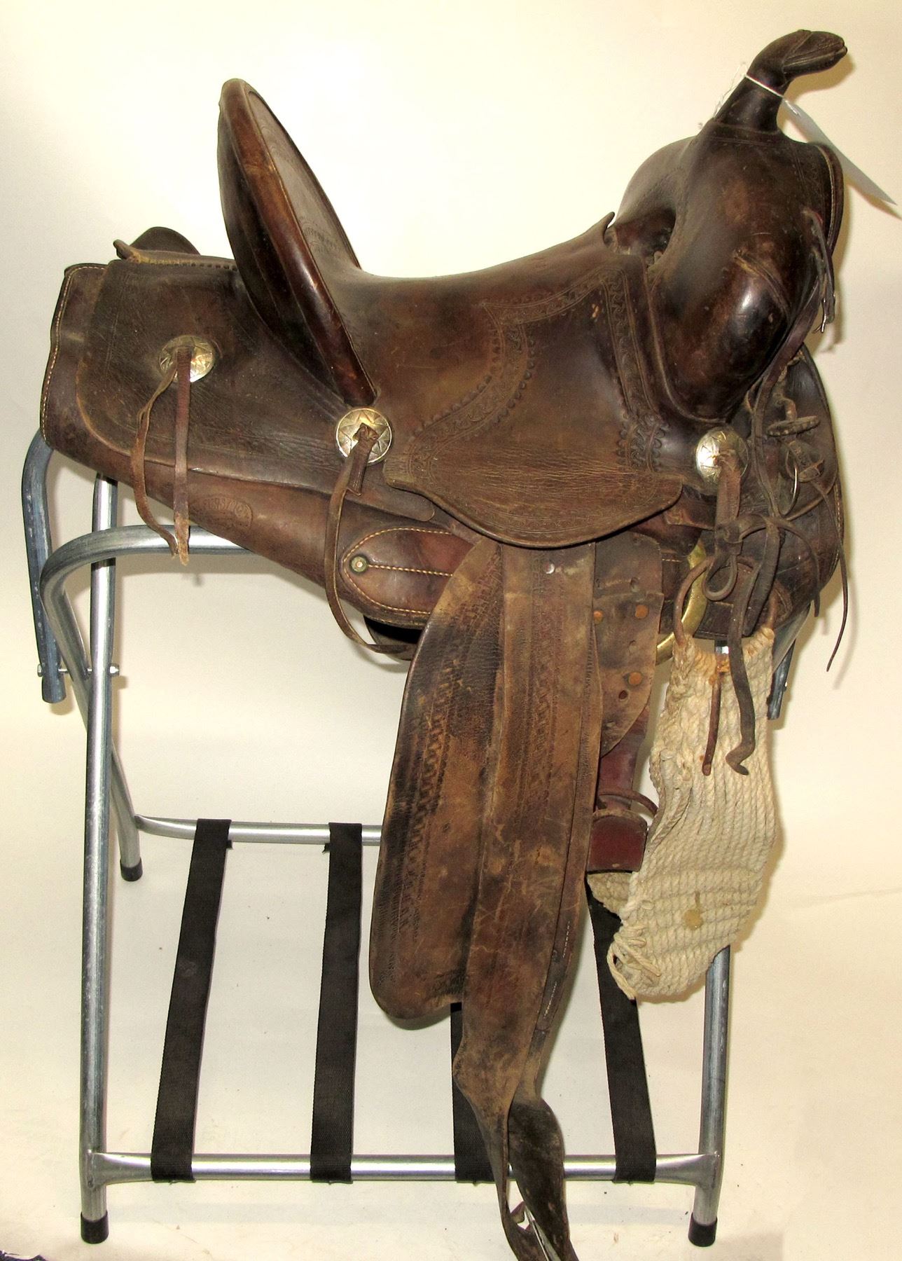 Classic Montana saddle. c1920's, high back cantle. marked on the rear flanges as normal it has a 14" seat. Some worn holes in fleece.. Date: City: State: Montana HWAC# 56451