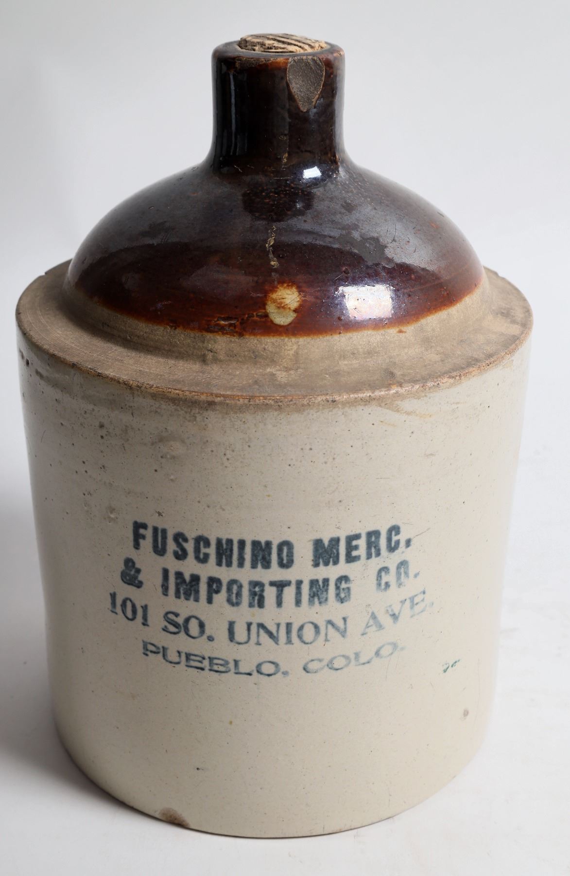 FUSCHINO MERC./& IMPORTING CO./101 SO. UNION AVE./PUEBLO, COLO. 2 gallon jug. Unlisted variant. Preble ( J 203) for reference. Top is brown glaze, the rest is white glaze. 10 3/4" tall. A 1/2" shallow chip in the top of the jug. Two 3/8" very shallow flakes off of the rim. A 1/2 " flake near base . No other cracks or chips.