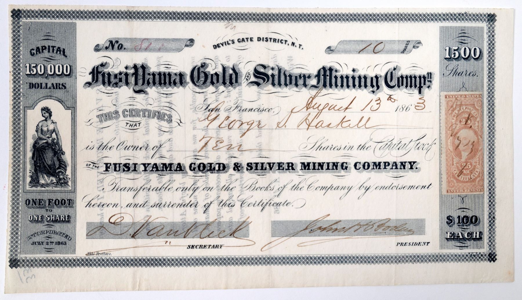 # 81 for 10 shares to George Haskell. Signed by D. Van Vleck and John H Boden. Dateline San Francisco August 13, 1863. Incorporated July 2, 1863. 25c Certificate revenue stamp. Not cancelled. Allegorical vignette on left. "One foot to one share". Location: Devil's Gate District, N. T. Nahl Brothers printer. This cert has a great deal of history associated with it. Haskell was the postmaster for Eureka, Lander County ñ yes, before Eureka County was created. Boden was a Custom House broker in San Francisco for over 50 years. Van Vleck was a very early San Francisco wood engraver. The Nahl brothers were early California artists and engravers. At the University of California, Berkeley there is a copy of "Scrap-book of the engravings of Durbin Van Vleck, many of them from drawings made by Charles and Arthur Nahl." Biography on the Nahl brothers, Van Vleck and their relationship to each other.