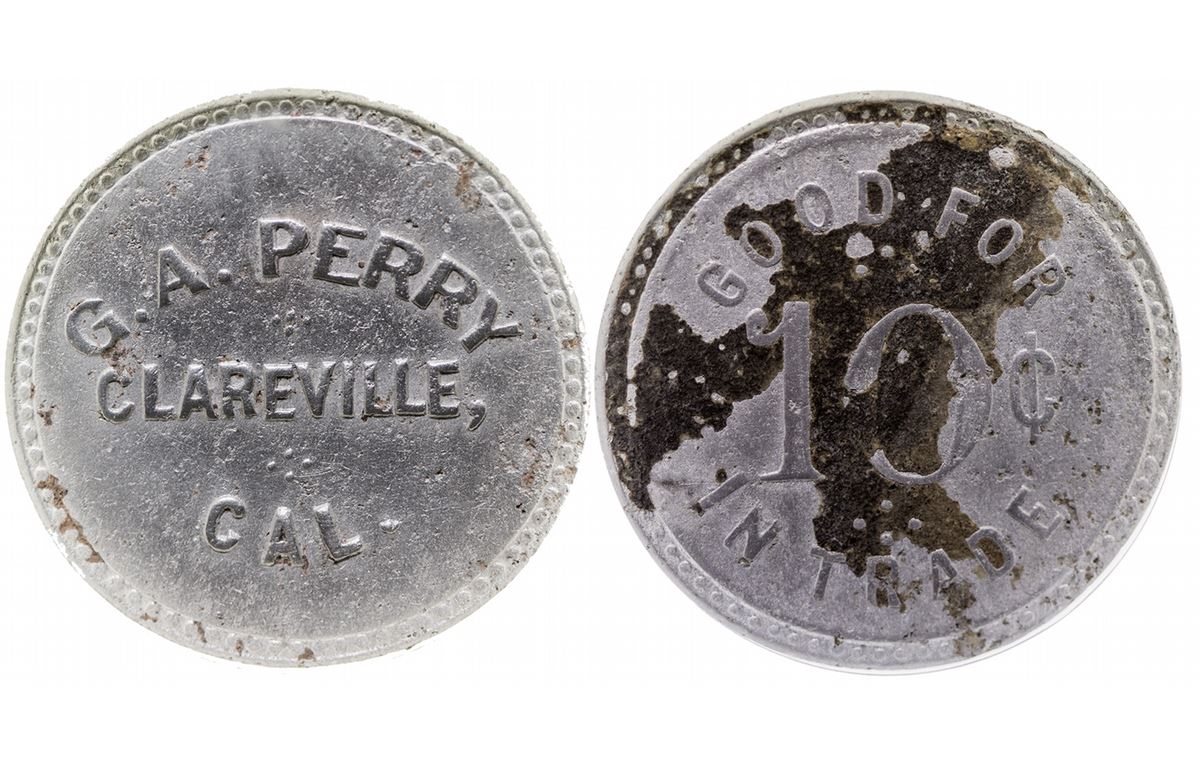G A Perry / Clareville / Cal. // GF / 10c / IT. Very rare token.