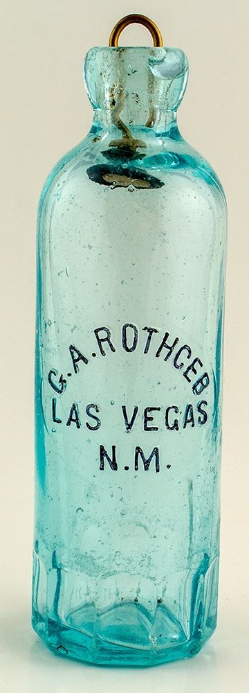 G. A. Rothgeb, Las Vegas, New Mexico. Fluted base, tall aqua hutch. Embossing in round slug plate. Blank base. Cracks in base and top. Clean, rare. City: Las Vegas State: New Mexico Inventory Number: 38915