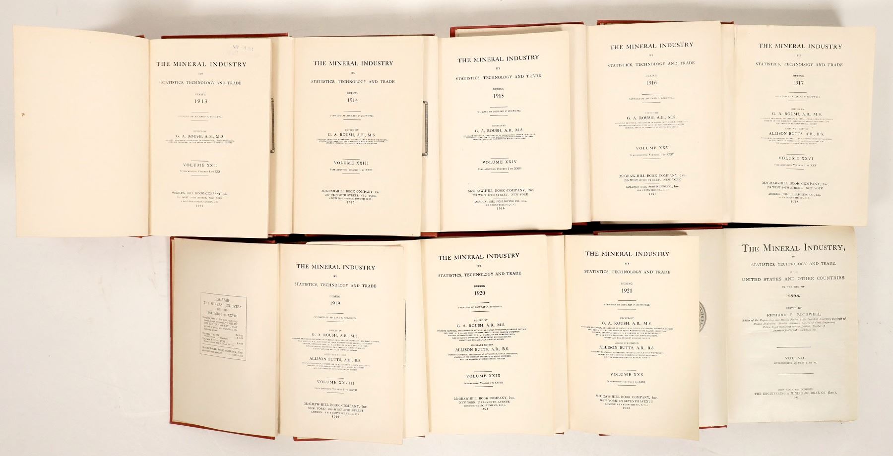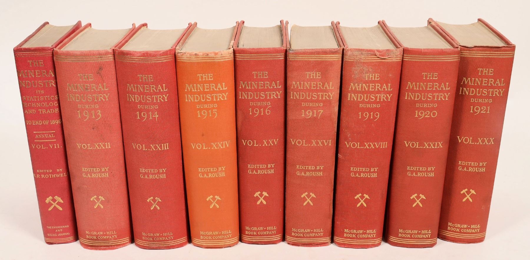 A collection of nine books in the "The Mineral Industry" series, edited by G.A. Roush and published by the McGraw-Hill Book Company. These books discuss the findings of geological surveys, updates in mineral-related science and technology, and market updates regarding certain minerals on a year-by-year basis. This collection contains the 1899 book as well as each book in the series for the years 1913 to 1921, with the exception of 1918, which is not present. The books are in good condition; all spines are intact, and while there is some toning and fading consistent with age, wear is very minimal.