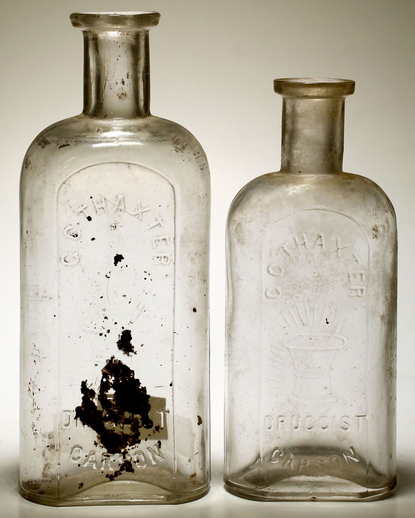 C. G. Thaxter (au) / Motif: Mortar& Pestle , surrounded by sun-rays. / Druggist / Carson ( Millville round ) // : ( Item#1 of 2 ) : Clear, tooled top, 6 1/8" x 2/3/8", Base: W.T & CO/ S / . Perfect, with ultra light stress lines in lip, not damage. Need a little cleaning, otherwise nice. ( Item#2 of 2 ) : Clear, tooled top, 5 3/16" x 2 3/16", Base: W. T & CO / A P. //. Light upper body staining, otherwise nice, no damage. (RH).