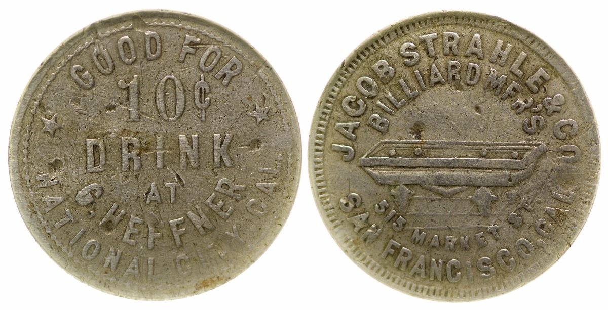 Jacob Strahle & Co. / Billiard Mfr's / 515 Market St. / San Francisco, Cal. // GF / 10c / Drink / At / G. Heffner / National City, Cal. Round, aluminum, 23mm. Slab, NCS, genuine. State: California City: National City Date: c. 1885 FHWAC#: 37444