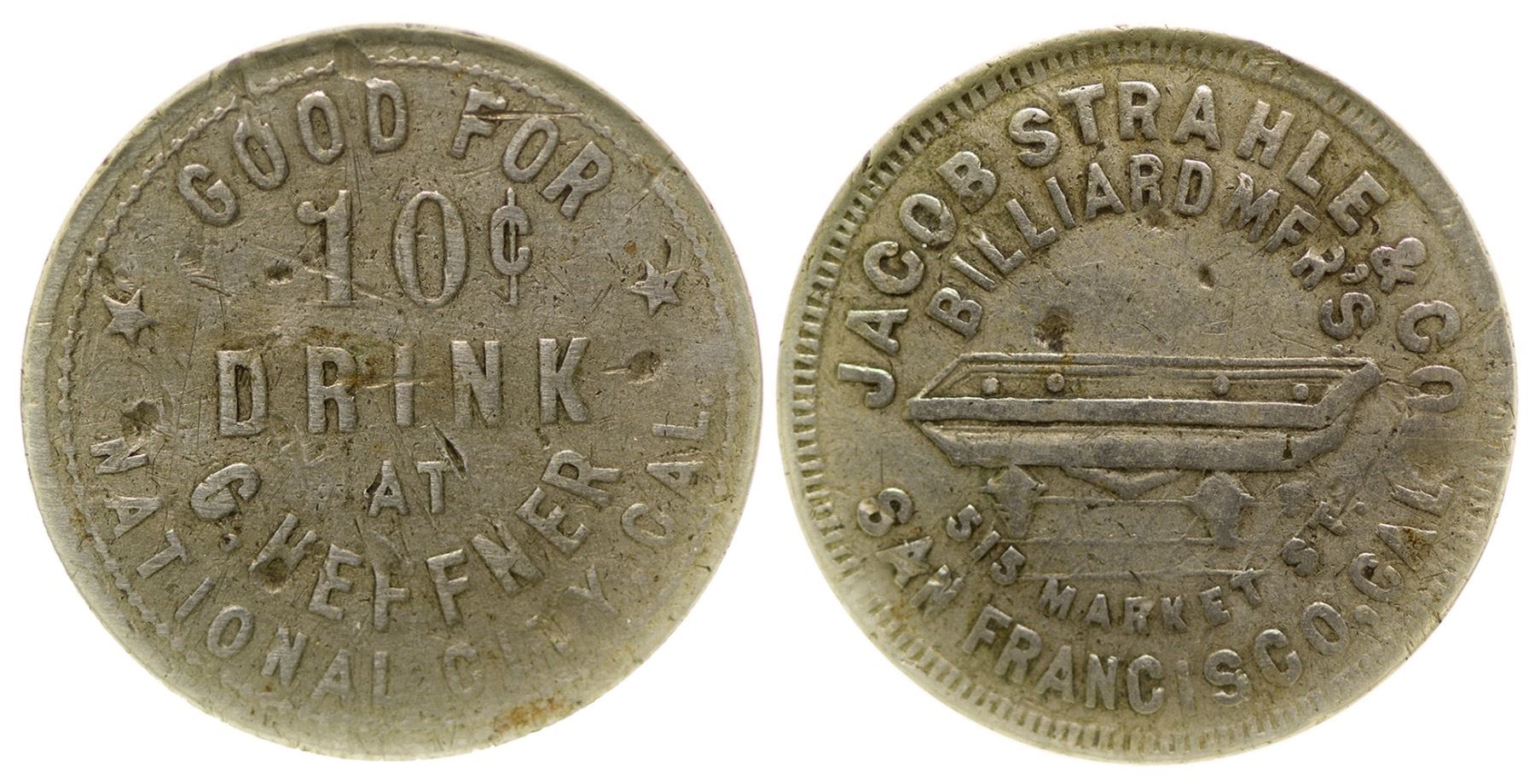 Jacob Strahle & Co. / Billiard Mfr's / 515 Market St. / San Francisco, Cal. // GF / 10c / Drink / At / G. Heffner / National City, Cal. Round, aluminum, 23mm. Slab, NCS, genuine. HWAC# 37444 Date: c. 1885 Location: National City, California