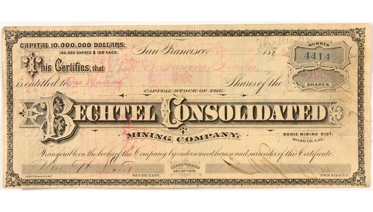 Grafton Tyler Brown was one of the first African American lithographers in the American West during the mid to late 19th Century. He was one of the first to illustrate views of California and the Pacific Coast. He also created the 2 earliest bird's eye views of Virginia City. By the time he was 26, Brown owned his own firm located in San Francisco. This stock certificate was issued to an H.B. Parsons Trustee for 100 shares on March 9, 1880. The Bechtel Consolidated Mining Co. was located in the Bodie Mining District in Mono County. The stock has some wear including creases and some stains. [REF: Robert Chandler, San Francisco Lithographer African Americana Artist Grafton Taylor Brown. 2014].City: BodieCounty: San FranciscoState: CADate: 1880