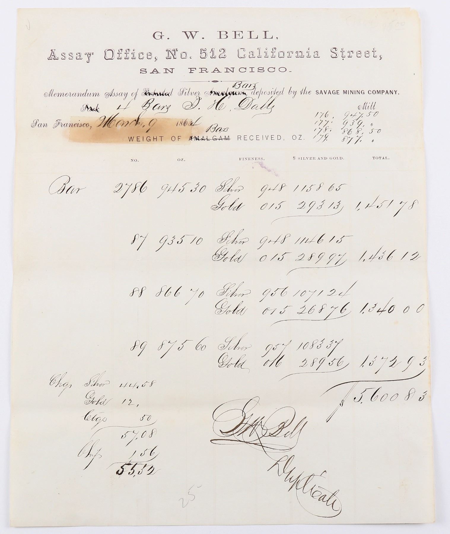 G.W. Bell Assay Office, Savage Mine, Dalls Mill, Franktown, NV, 1864. Nevada territorial deposit of Silver Bars (bullion crossed out) deposited for the Savage Mining Company in Virginia City, Nevada from J.H. Dalls on March 9, 1864. The Dalls Mill was located in Washoe Valley at Franktown. Four bars, ranging in size from 866.7 to 945.3 ounces, all .948 or higher fineness in silver. Total value is about $5,600. Signed by Bell at the bottom. Folds, 2.5 tape repair over heavy soiling patch at top left. According to the General History & Resources of Washoe County, Nevada (1888), J.H. Dall & Co. built the quartz mill at Franktown in 1861, the largest in the country at that point, at a cost of $250,000. It had 60 stamps (40 dry crushing, 20 wet crushing), and its bullion output was 25% greater than the other mills. It burned down in 1865, was rebuilt, and burned down again. This publication credits the loss of Dalls Mill as a major contributing factor for Franktown's downfall. (Al Adams Gold Rush Memorabilia Collection) Date: Location: San Francisco, California. Size: 7.5 x 10 inches. See other Bell Assay Receipt in the Numismatic Section.