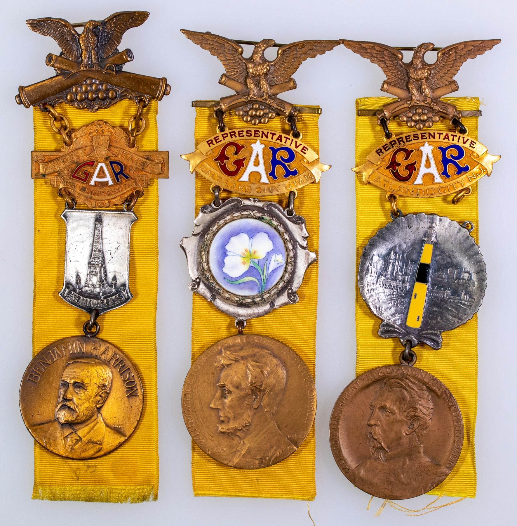 Three choice GAR badges with presidential medallions, 1909, 1910, 1920, all with yellow ribbon backing, all with red, white, blue enamel filling GAR . 1920: Harrison, 40mm, Indianapolis silver color rectangle at center. 1909: Lincoln, 44mm, poppy on white enamel at center; 1910: Gen. Kearny, 44mm, uniface, silvered shell with enamel light house at center. All three are very rare.