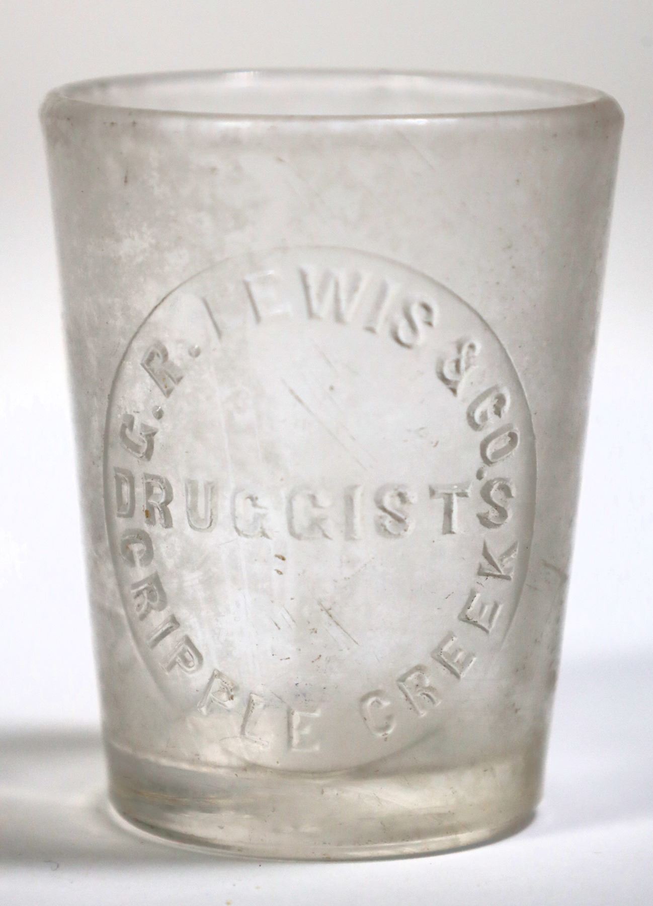Embossed dose glass. G.R. Lewis & Co. / Druggists / Cripple Creek. Reverse has marks for Tea, Dessert, and Table doses. WT & Co., AN, USA. 1 7/8" Description: stains, no cracks or chips. GR Lewis opened his pharmacy in 1900. He was later involved with the First National Bank and became wealthy investing in Cripple Creek mines.