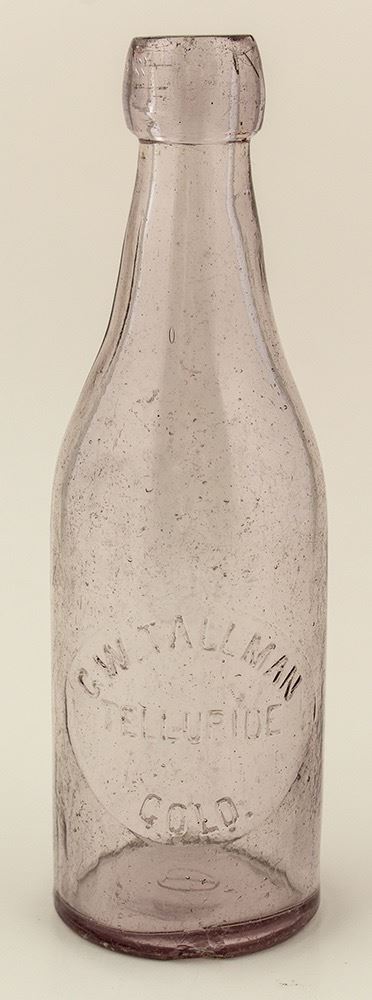 GW Tallman Telluride, Colorado. Tall clear (pink tinge) pint blob top beer bottle. Similar to Preble B 200, however, the top is similar to B 190, the classic beer blob top. This is an unlisted variety. This example has the insignia on the base, the embossing in a circular slug slate, is clean, clear, and crisp with the exception of some base wear and a base chip. City: Telluride State: Colorado Inventory Number: 39500