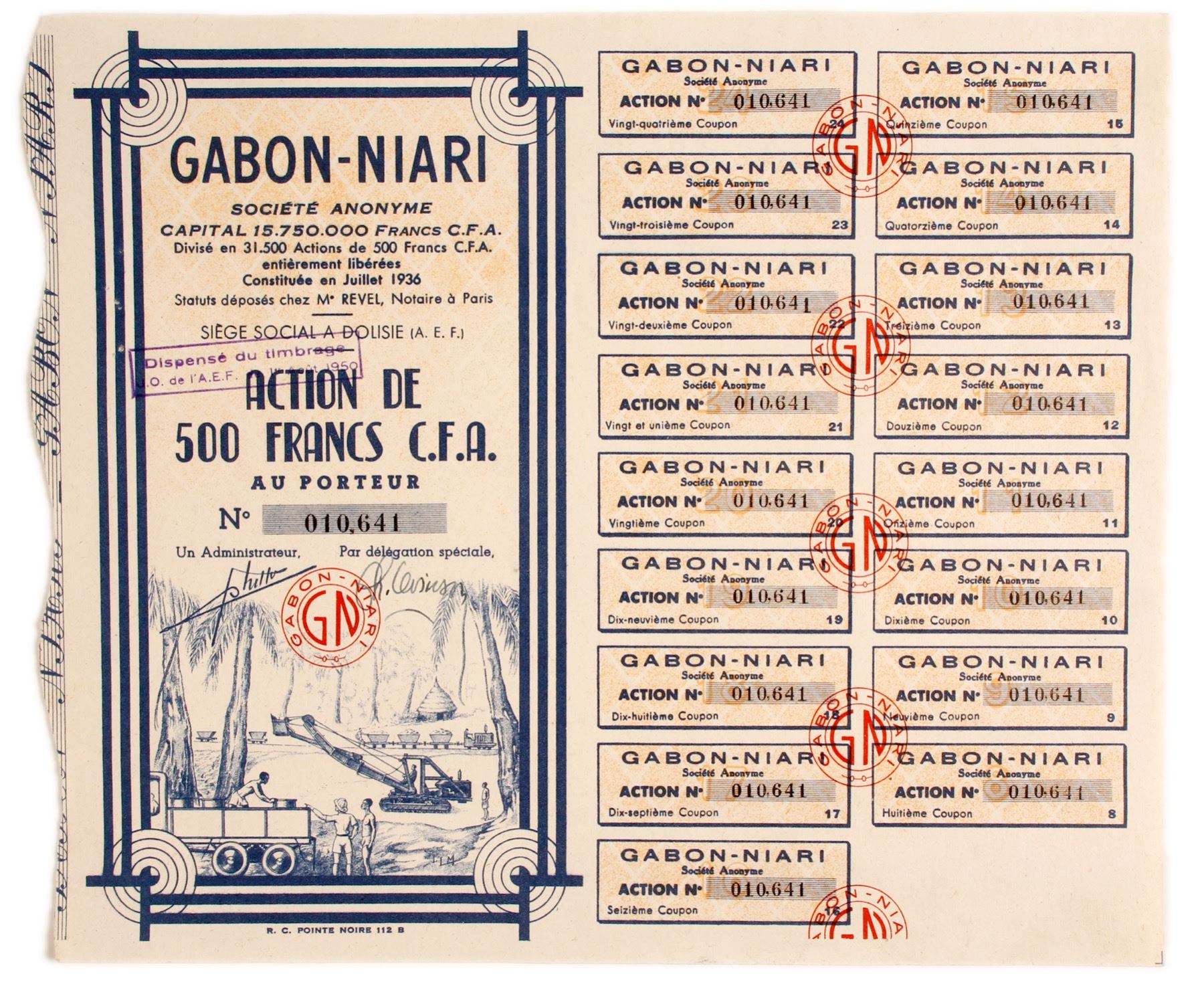 1 total certificate. Signed and not issued; revenue coupons still attached, in very good condition. Gabon was the richest of the former French Equatorial African colonies in known mineral deposits. In addition to oil, which accounted for 80% of the country’s exports in 2004, Gabon is a world leader in manganese. City: State: Date: 1936 HWAC# 81822
