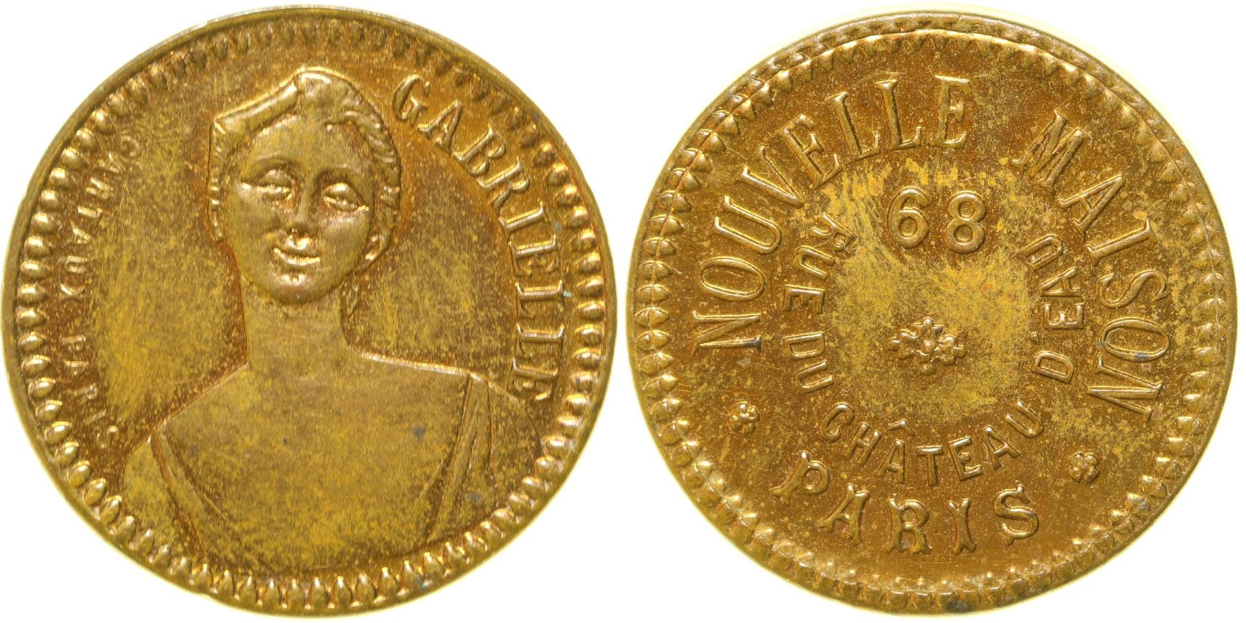Obv.: Gabrille / Cartaux Paris; Rev.: Nouvelle Maison / 68 / Rue Du Chateau D' Eau / Paris. Br. rd., 22 mm.