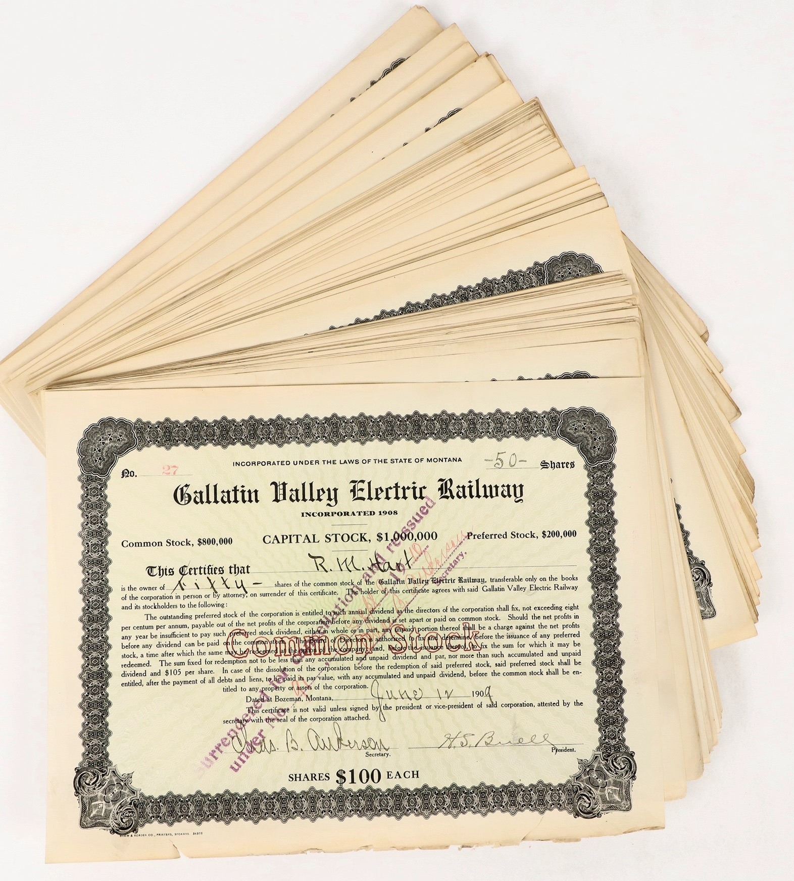About 20 issued and 30 unissued stock certificates issued by Gallatin Valley Electric Railway. Issued stocks dated 1909.