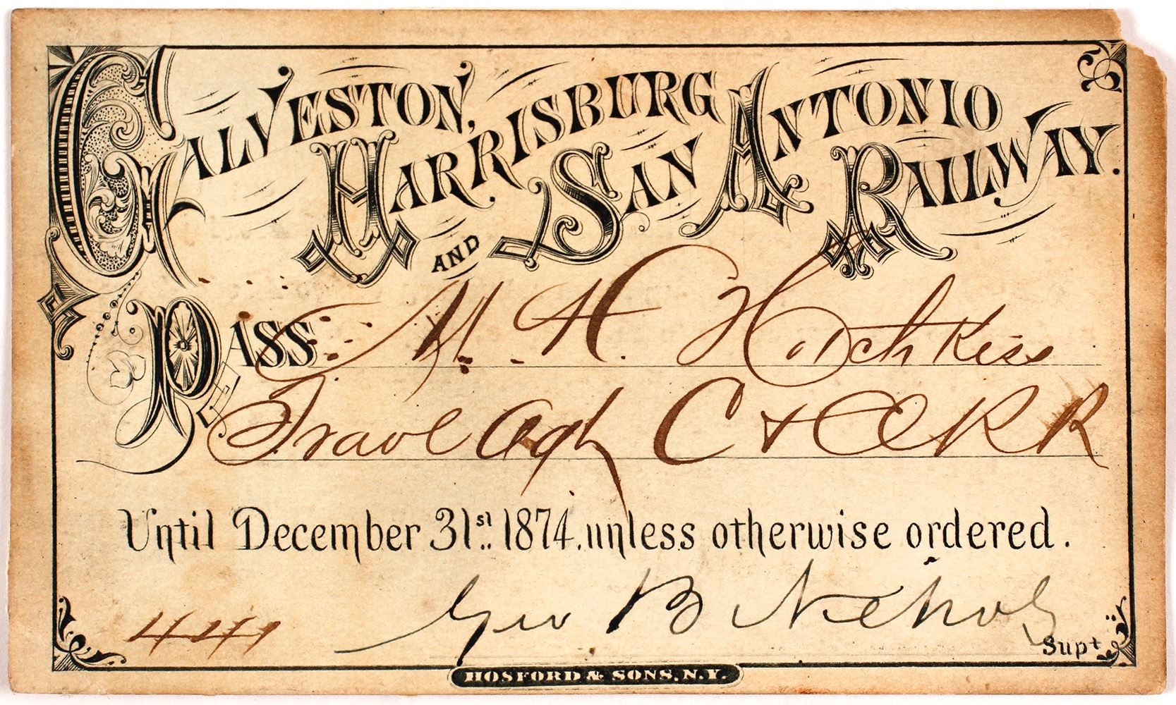 Number 444 to NH Hotchkiss, travel agent, Chesapeake & Ohio Railroad. Major Hotchkiss was born in New York and moved to Virginia about 1859. He is best known for his connection with the Chesapeake & Ohio Railroad. He was a pioneer in the movement to bring about a better understanding between the estranged North and South by organizing an excursion of Northern newspapermen South. Paper is glued to the back. One corner is torn and one is dog eared. (Potter Collection) Date: 1874 Location: Texas HWAC# 58341