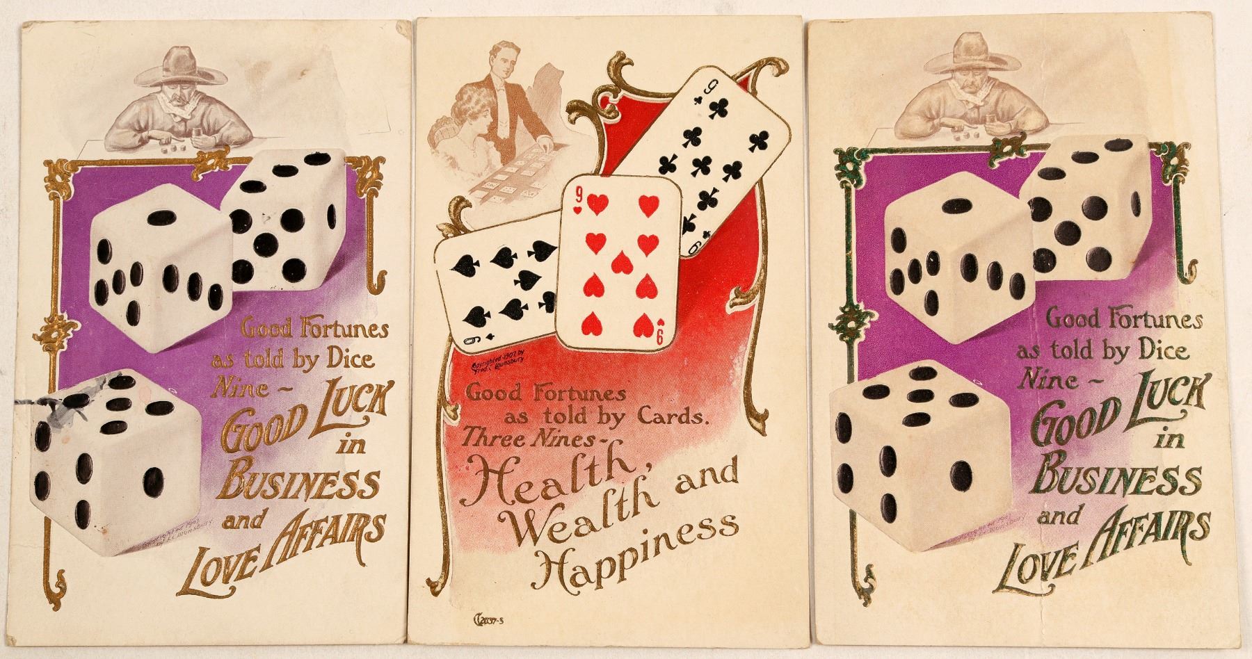 3 Post cards. Good Fortunes as told by Cards. Three Nines-Health Wealth and Happiness; Good Fortunes as told by Dice Nine; Good Luck in Business and Love Affairs.