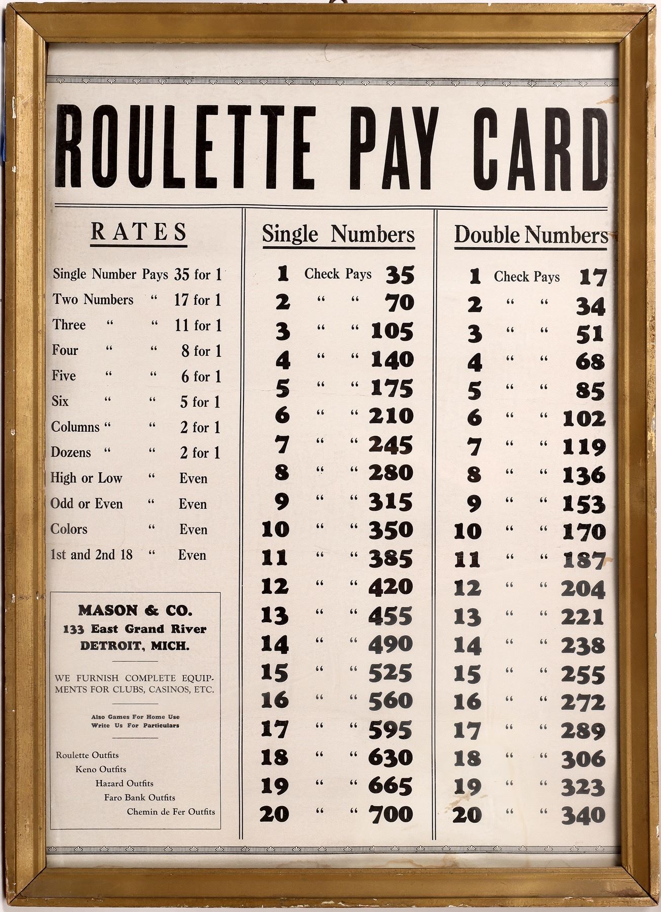 Mason & Co, Detroit, original Roulette Pay Card, Broadside. Size: 26 x 19". Lot also includes a box top for Mason & Co Hub Poker chips, Circa 1930. This broadside likely hung in one of the many Nevada or Western casinos during the 1930-1940 period, right after gaming became legal again. City: State: Date:1900-1910.