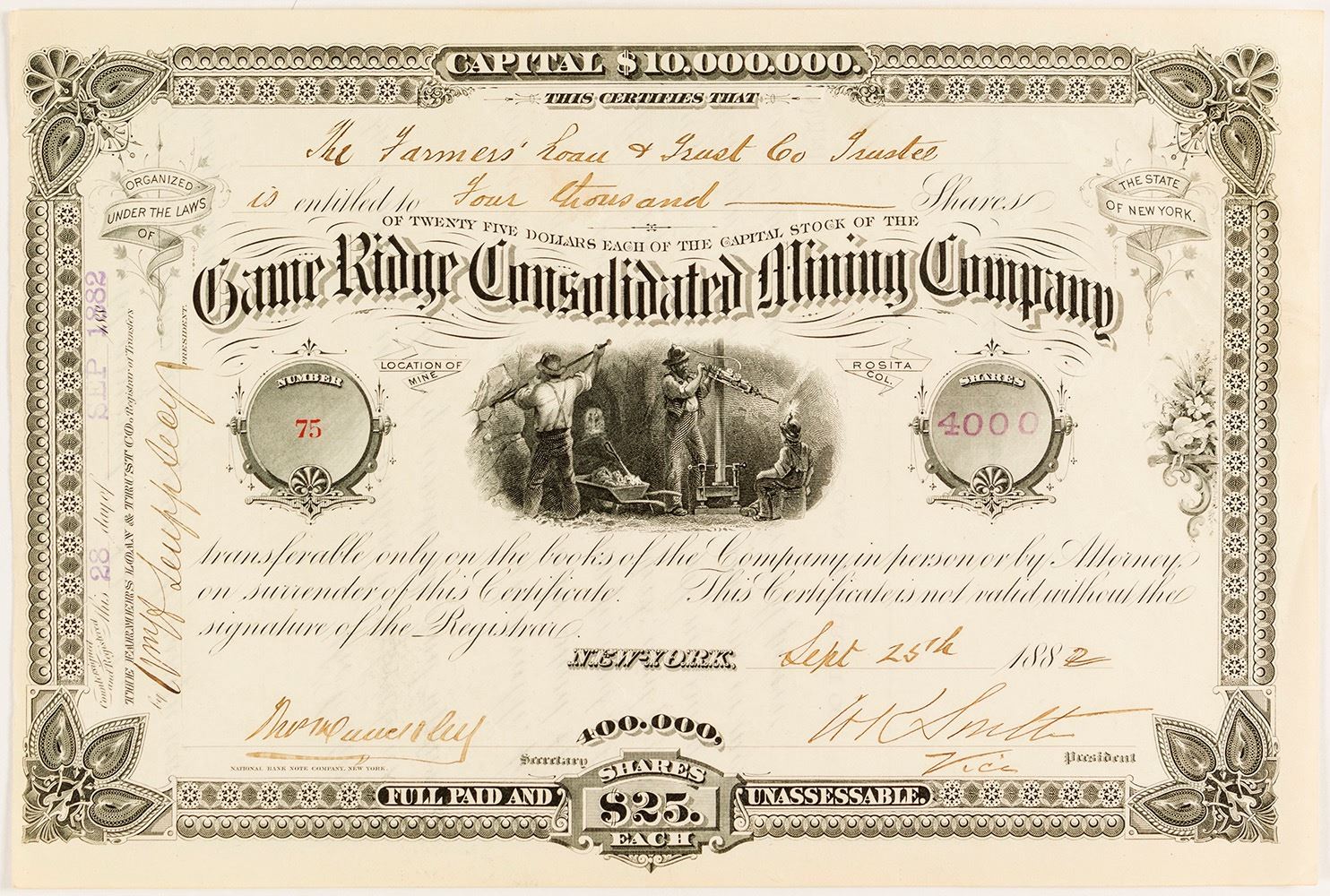 I/U 1882 to Farmers Loan and Trust Co. #75 4000 shares signed by vice president Smith. 7" x 10.5". Date: Location: Rosita, Colorado HWAC # 54369