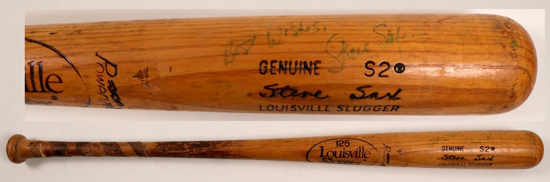 This is a game bat signed by Steve Sax. Bat is 125 Louisville Slugger. Powerized. Genuine S2. #3 on the bottom of bat. Autograph in green above genuine S2. Autograph says, "Best Wishes, Steve Sax". Bat shows lots of wear as well. City: State: Date: