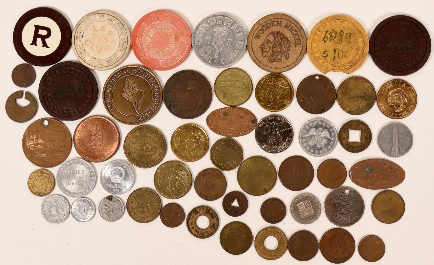 Wooden and plastic gaming chips, 3 Asian, 4 other. Over 30 various metal tokens.