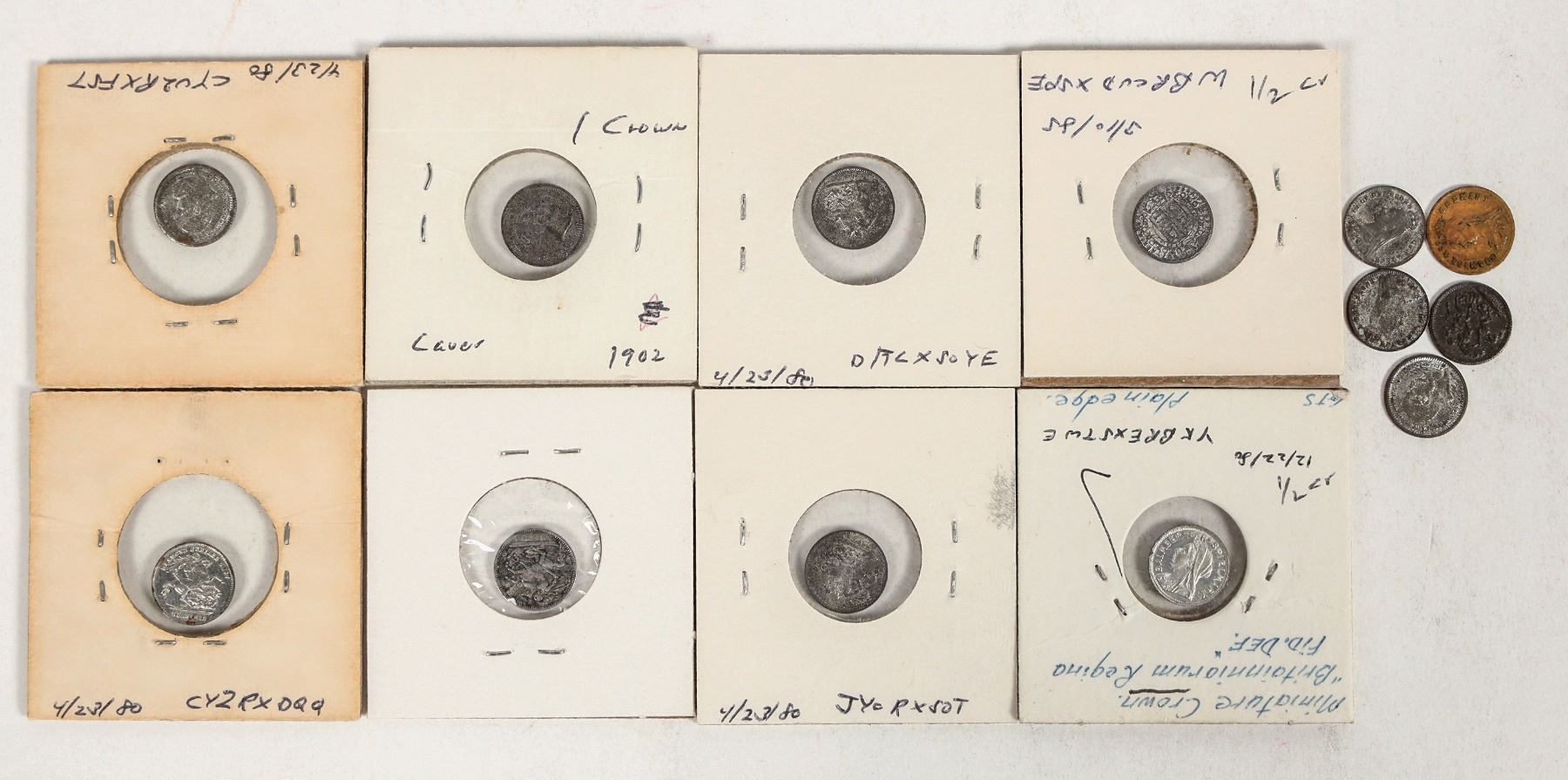 Eighteen brass and zinc Lauer gaming counters in the form of a British 1 Crown coin. Most obverses have Queen Victoria, but a few have King George VIII. Reverses vary between King George and the Dragon and a coat of arms motif. 12mm diameter.