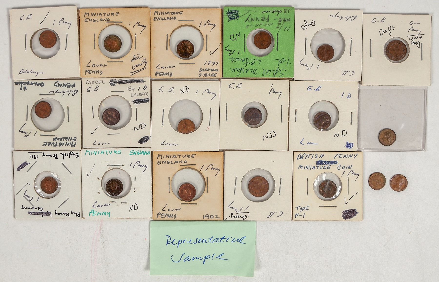 Thirty-four brass (most) and zinc (some) Lauer gaming counters in the form of a British 1 penny coin. Dates vary from 1897, 1902, and 1911. Three styles: Queen Victoria obv., Britannia rev, qty 22; King George VIII obv., Britannia rev, qty 8; "ONE PENNY" on obv. and rev, qty 4. 12mm diameter.