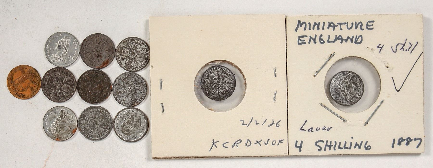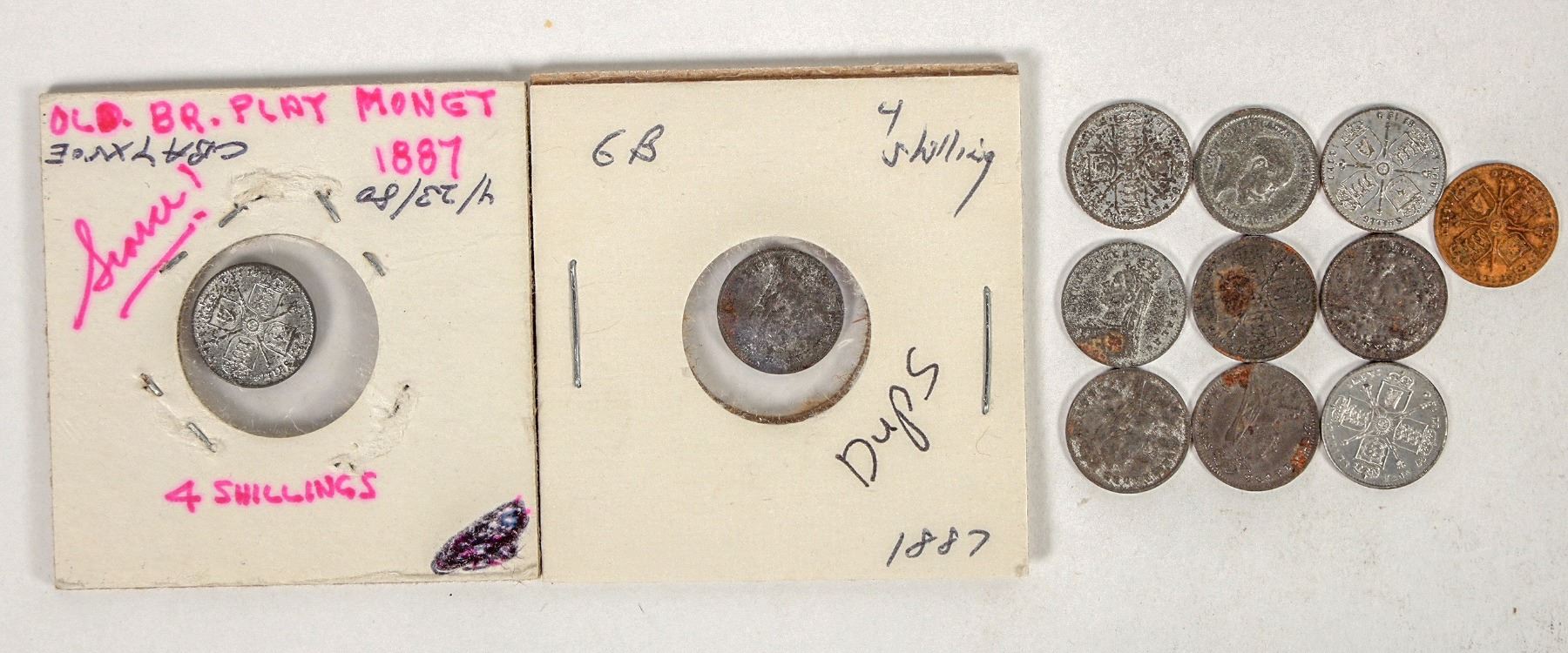 Eleven thin brass Lauer gaming counters in the form of a British 4 shilling coin. Two bear the images of King George VIII, nine have the image of Queen Victoria. Reverses all have a four-fold coat of arms design. 12mm diameter.