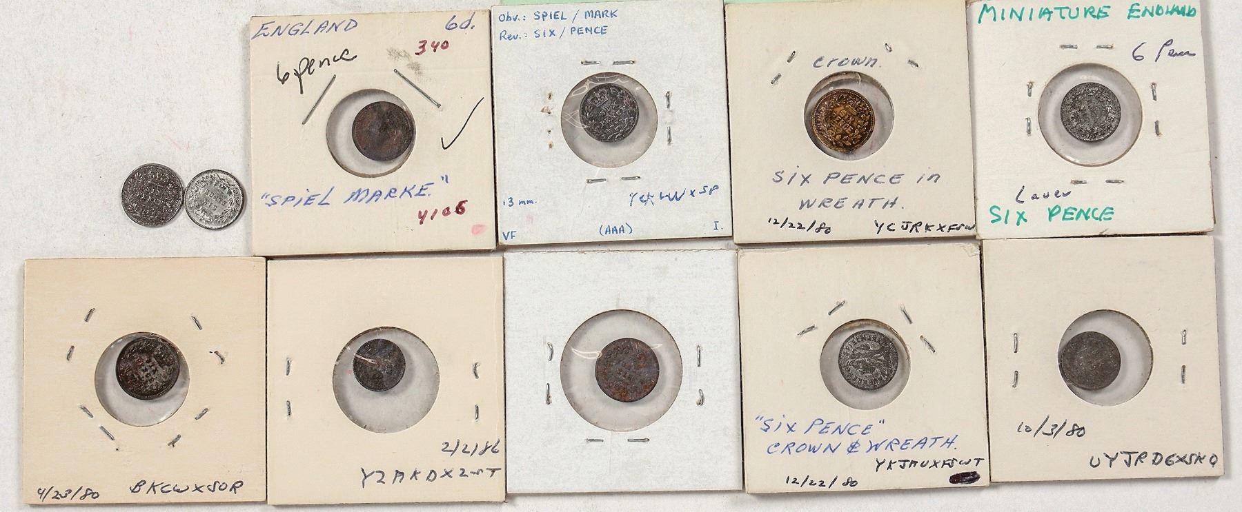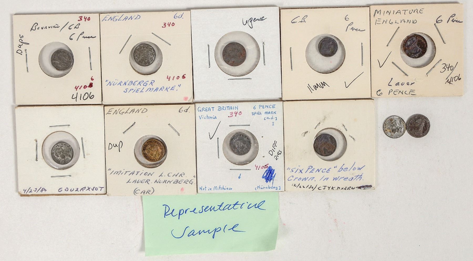 Fifteen Lauer gaming counters in the form of a British 6 pence coin. Three styles: Queen Victoria obv., "SIX PENSE" rev, qty 12, 12mm; King George VIII obv., lion on crown rev, qty 1, 12mm; 12mm diameter; "SIX PENSE" both sides, qty 2, 10mm diameter.
