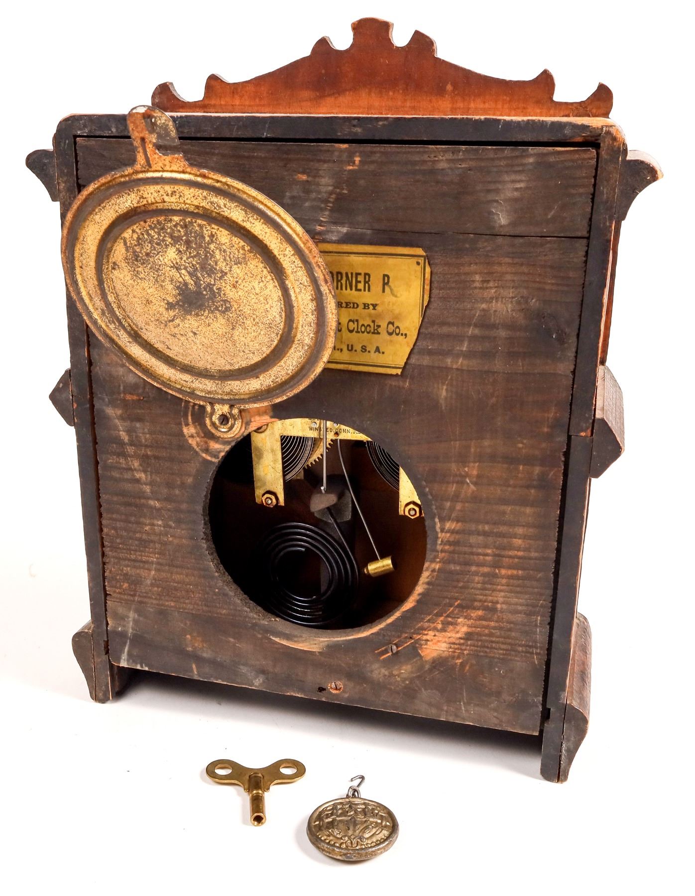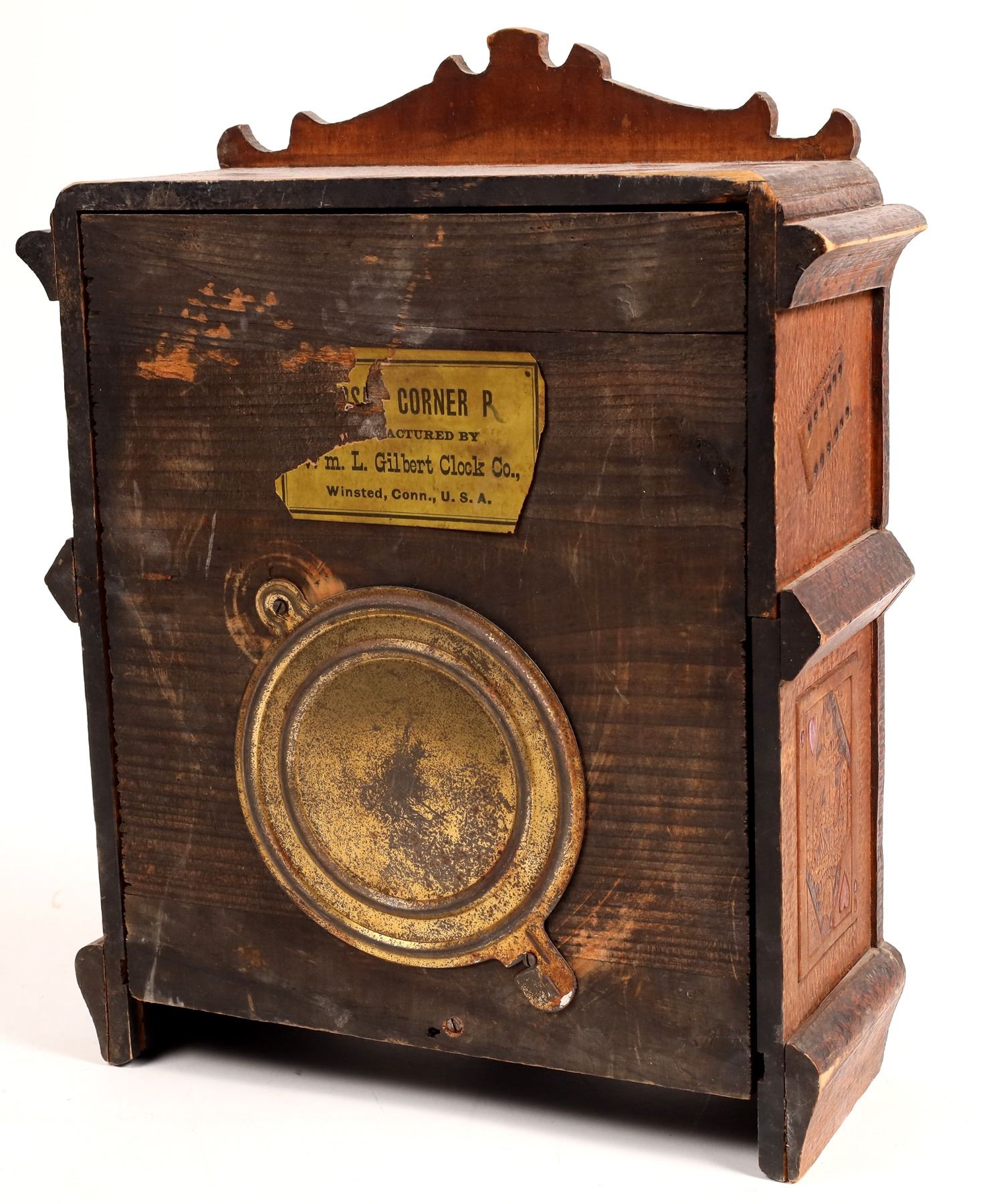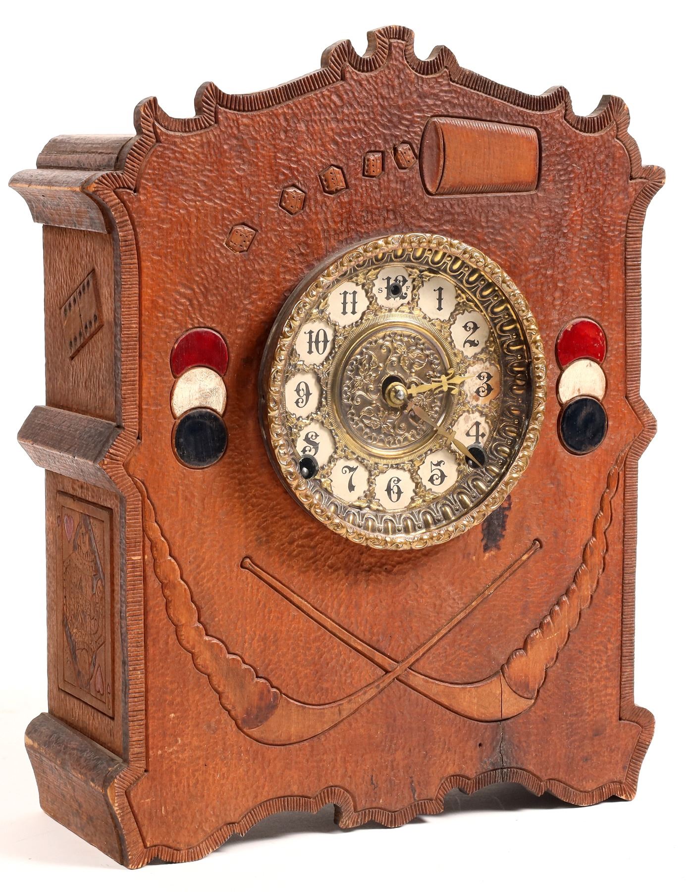 Unusual vintage gaming themed table clock by Wm. L. Gilbert Clock Co., Winsted, Conn. Features dice, playing cards, poker chips, dice cup and 2 clay pipes with smoke. 13.5x11x4". Lower right case front has a 2" crack. No winding key. Clock movement is loose.