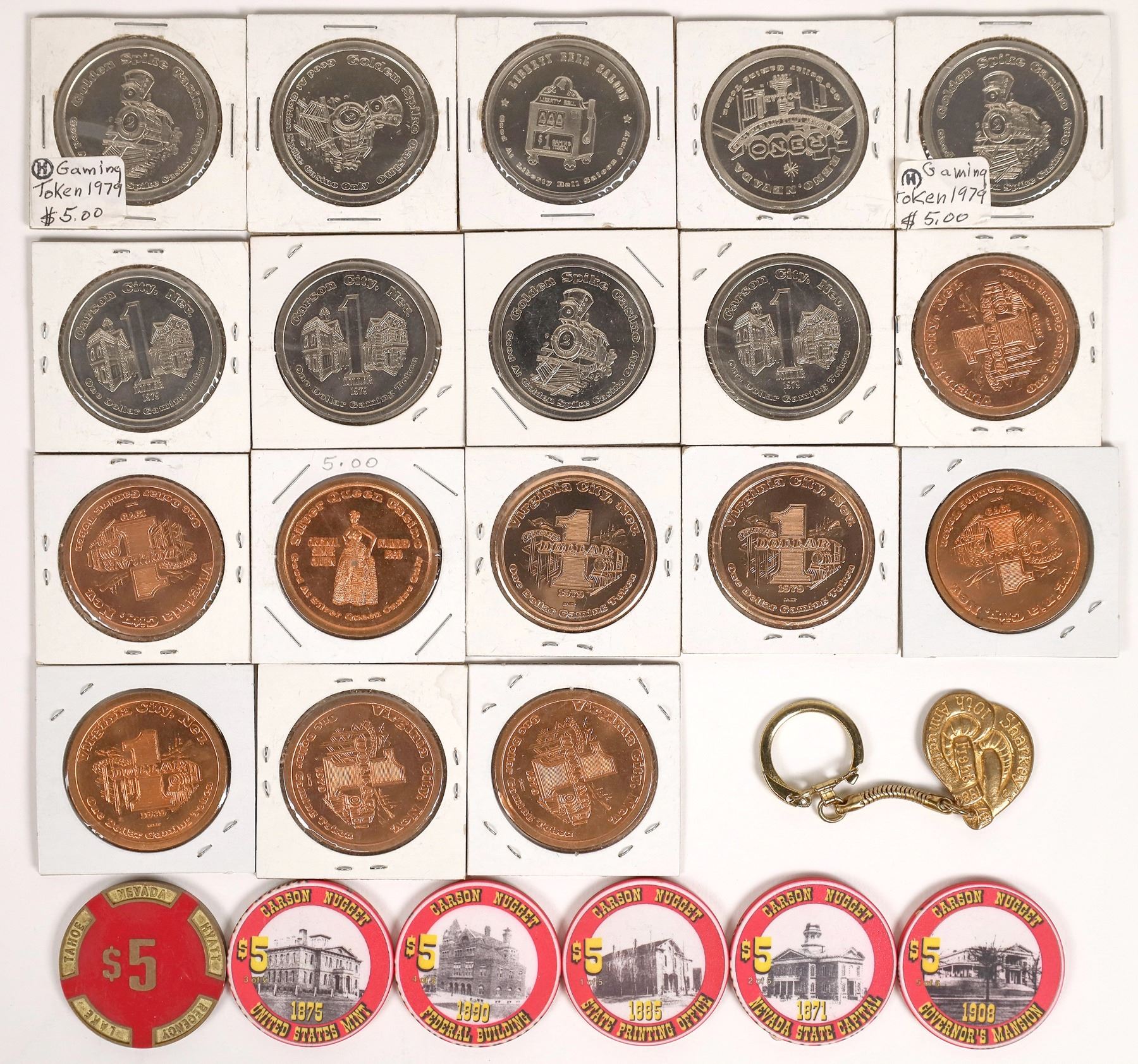 Hyatt Regency Lake Tahoe $5 red and brass chip; five Carson Nugget $5 chips with pictures of historic Carson City buildings: Governor's Mansion, Nevada State Capital, 1890 Federal Building, 1875 United States Mint, 1885 State Printing Office. Sharkey's casino commemorative key chain "10th Annual Fight" (1983). Nevada City Mint gaming tokens: Silver Queen Casino Virginia City (9); Golden Spike Casino, Carson City (7); Liberty Bell Saloon, Reno (2).