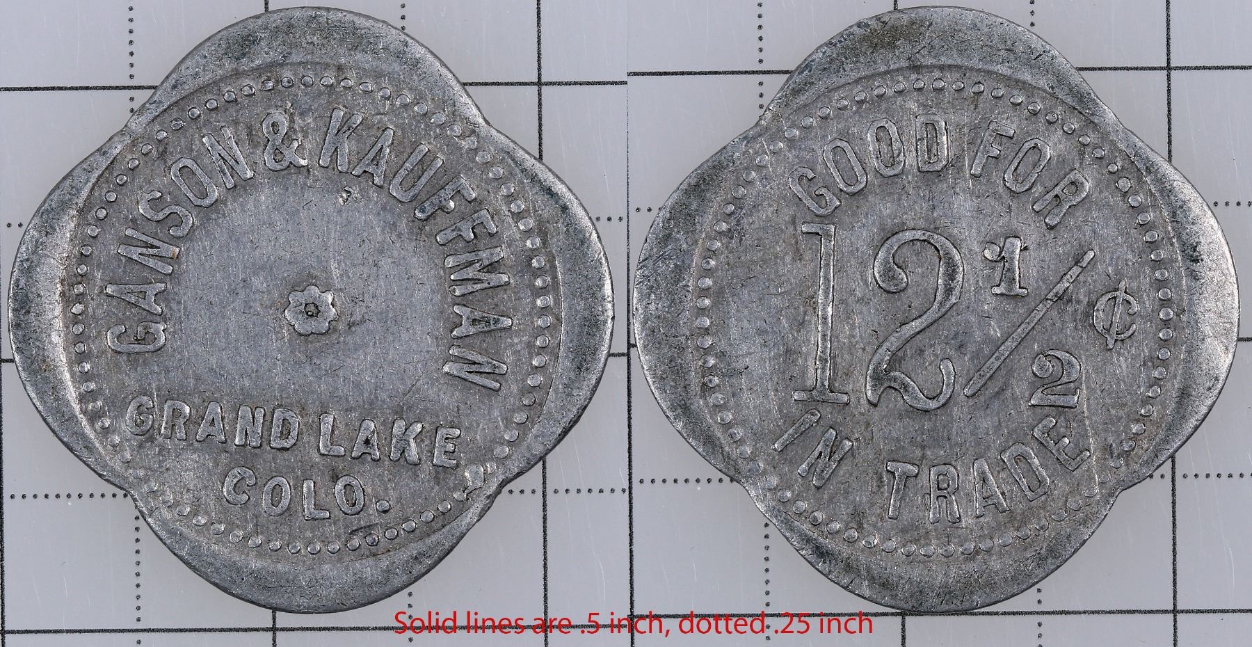 GANSON & KAUFFMAN / GRAND LAKE / COLO. // GOOD FOR / 12Ω¢ / IN TRADE; Al., Sc 4, 28 mm.