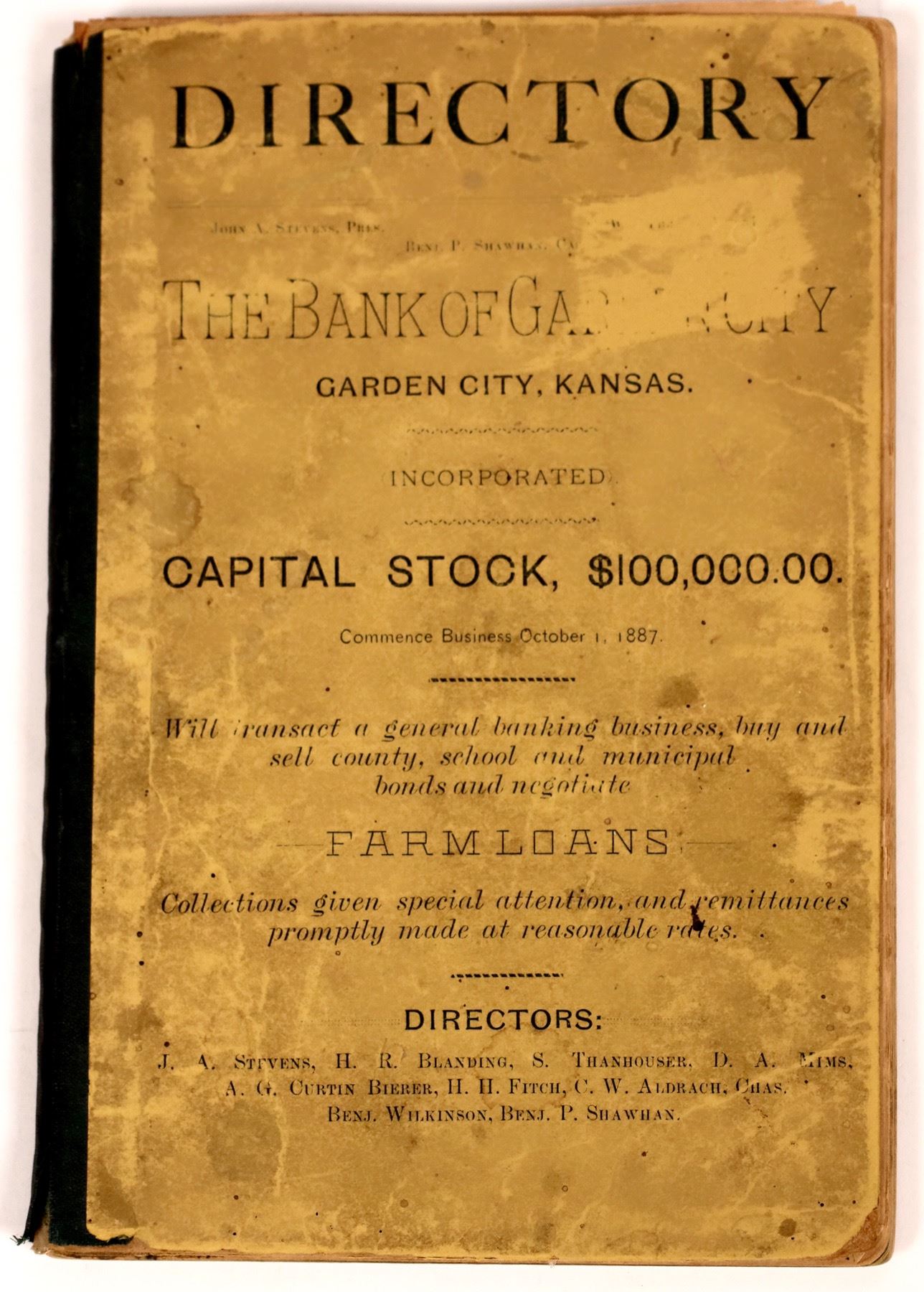 Directory of Garden City, Kansas by Chas. N. Campbell in August 1887. Contains information of businesses, offices, citizens, and other agencies in Garden City. 1887. Binding is coming loose with many pages now detached from the book proper. 8.5 x 5.5 inches.