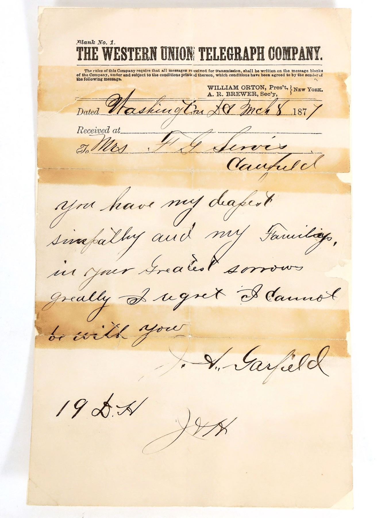 This is a Western Union Telegram that at first glance, appears to have been signed by future president James A. Garfield. A closer look reveals that it was probably signed by a secretary of some other member of his staff. It's dated March 8, 1871 and sends condolences to a friend who is obviously going through a tough time. Please see photos for more details.