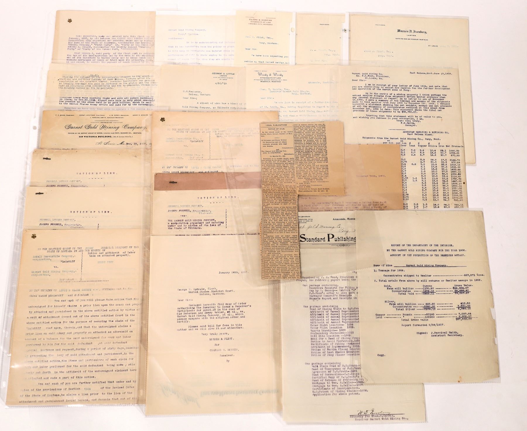 About 75 correspondences in binder related to Garnet Gold Mining Co. c. 1909-17. Letterheads, receivership, legal proceedings as the company failed etc. "In 1889, the Garnet Gold Mining Company and the Pony Gold Mining Company began operations in the Mineral Hill district. The Garnet Gold Mining Company was owned by investors in St. Louis. The company developed a group of 13 claims which came to be known as the Garnet Group." from westernmininghistory.com Pony Montana