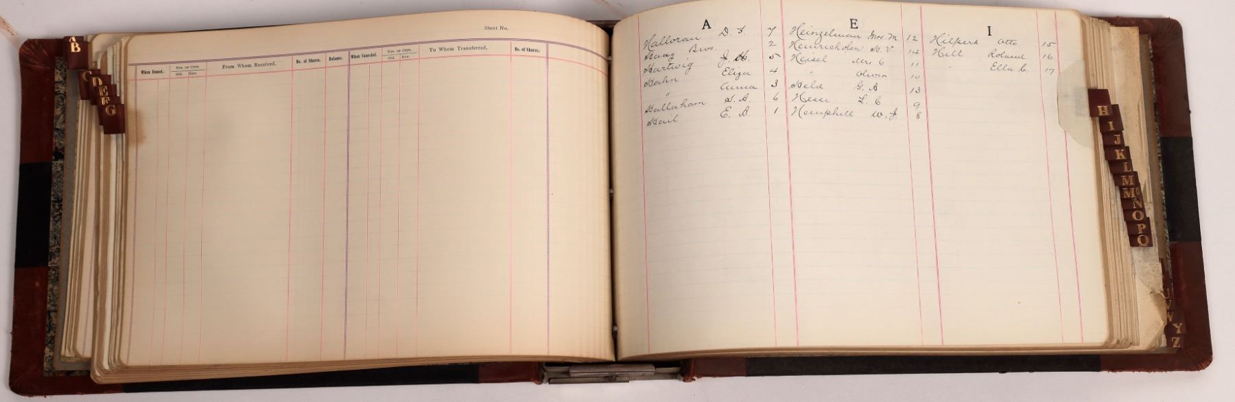 Stock ledger from the Garnet Gold Mining Company in Montana. This ledger shows records of who stock certificates were issued to and the number of shares received. Ledger is paginated alphabetically, with the name of the stock holder written at the top of each page. About 15.25 x 9.5, good condition. State:Montana City: Date: c1890s-1900s Provenance: Stuart Mackenzie Montana Ephemera Collection