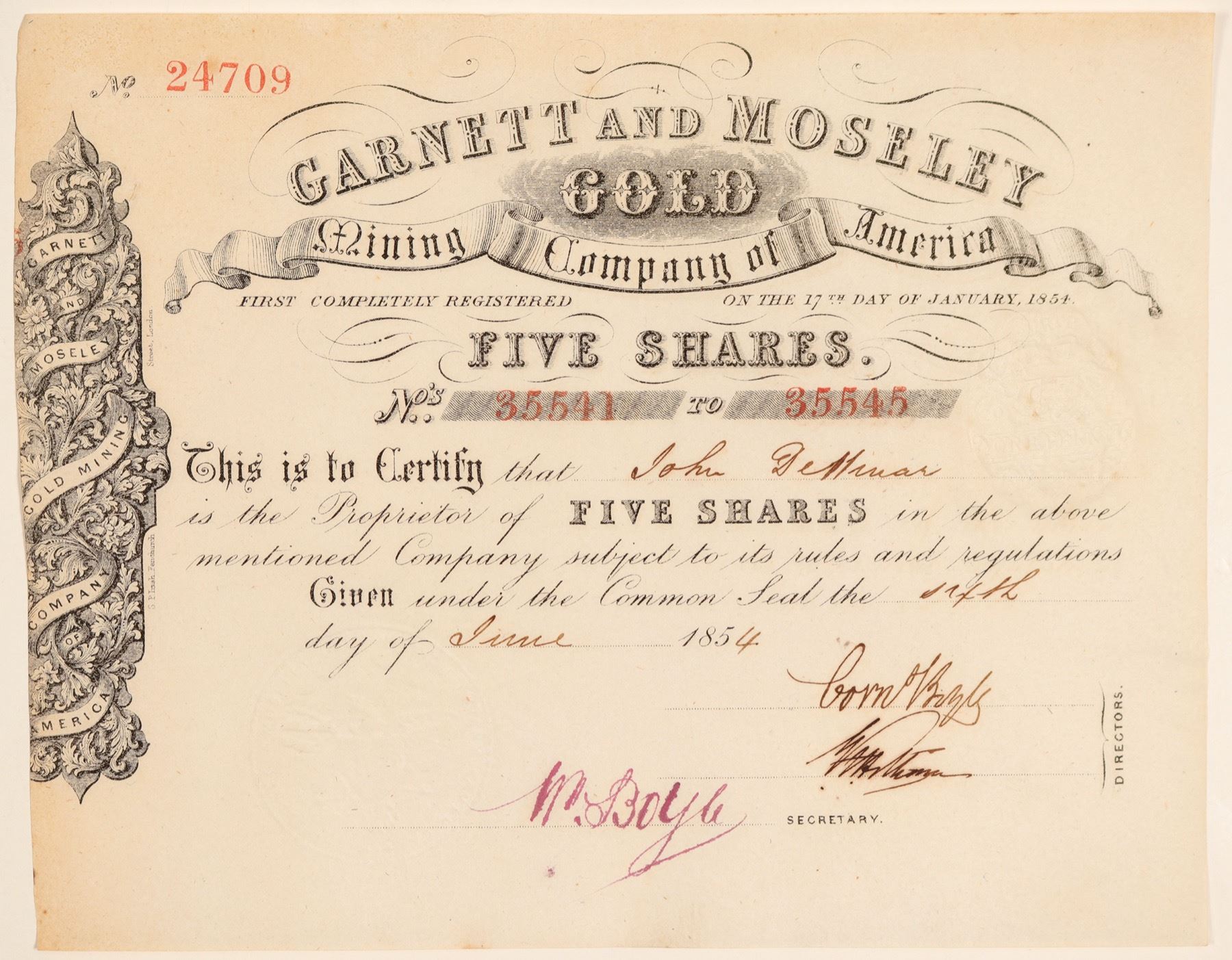One of the earliest issued Appalachian gold mining certificates we have seen. Registered on January 17th, 1854. Certificate No. 24709, issued to John Dehumar (?) for five shares, No. 35541-35545, on June 6th, 1854. Signed by C. Boyle (director) and Wm. Boyle (secretary). Ornate border with company name along the left. Cut left edge. Very fine condition. 6.75"x 8.5" According to Acts of the General Assembly of the Commonwealth of Virginia (1853), the company was formed to explore and mine gold, copper and other minerals in Buckingham County.