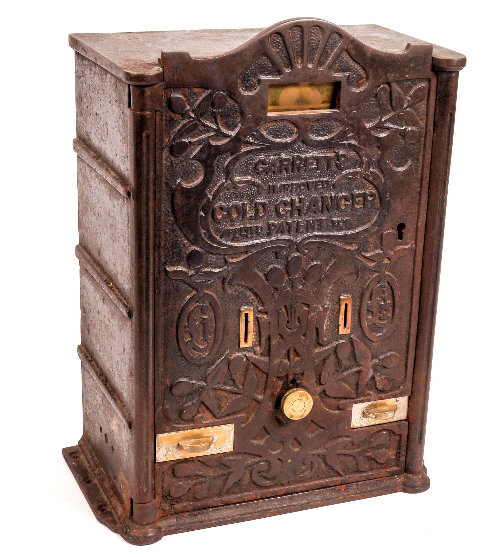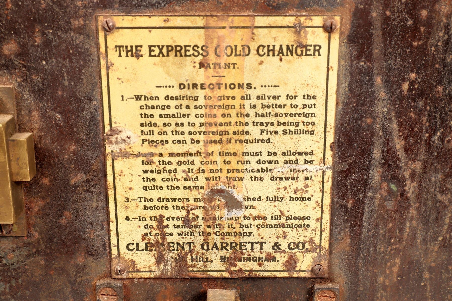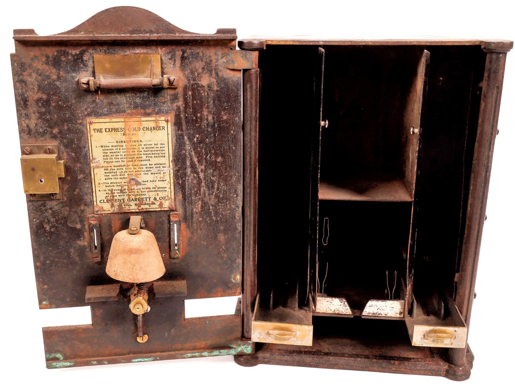Clement Garrett & Co "Improved Gold Changer." This unique cast iron coin changer appears to date to about 1890. While the machine notes patented pending, no information was found. The original company manufacturer plaque is present inside indicating the machine was made in Birmingham, England. There is no serial number indicating this is possibly one of the first made.