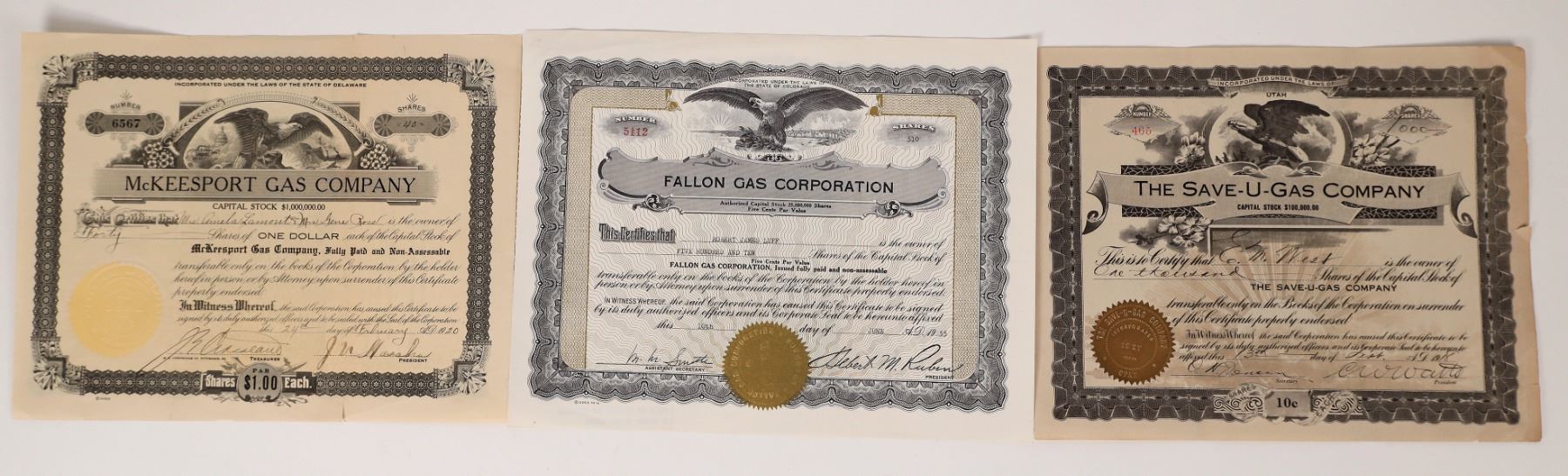 Gas station stock certificates (3), include The Save-U-Gas Company, issued to E.M West for 1,000 shares at 10 cents per share. It is signed by C.W. Watts, president and O.H. Jensen, secretary. Next McKeesport Gas Company, issued to Mrs. Pamela Lamonte and Mrs. Gene Ross for forty (40) shares at $1 per share. The president & secretary signatures are illegible. Lastly, we have Fallon Gas Corporation, issued to Robert James Luff for 510 shares at five (5) cents per share. Signed by M.M. Smithe, secretary and Herbert Ruben, president. All three have eagle vignettes. All in nice condition. Please see photos for more details. 1900s